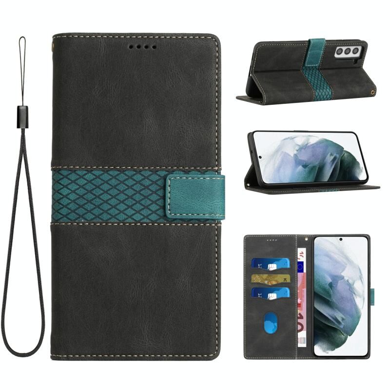 Για Samsung Galaxy S22 5G 5G Grid ραφή δερμάτινη θήκη τηλεφώνου με κορδόνι (μαύρο)