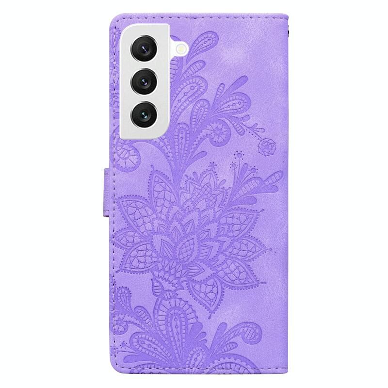 Θήκη κινητού τηλεφώνου Samsung Galaxy S22 5G από PU με δαντελένιο λουλουδάτο ανάγλυφο και μαγνητικό κούμπωμα, με λουρί καρπού (Πράσινο)