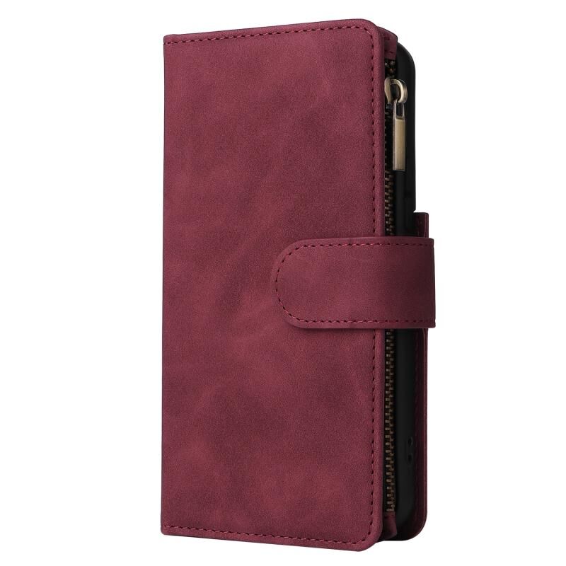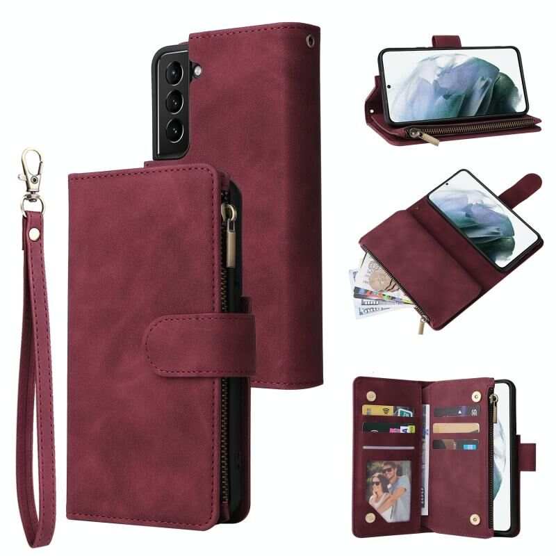Για Samsung Galaxy S22 5G Πολυλειτουργική θήκη τηλεφώνου με υποδοχή για κάρτες και θήκη για κάρτες, φερμουάρ, πορτοφόλι και κορνίζα φωτογραφιών (κόκκινο κρασί)