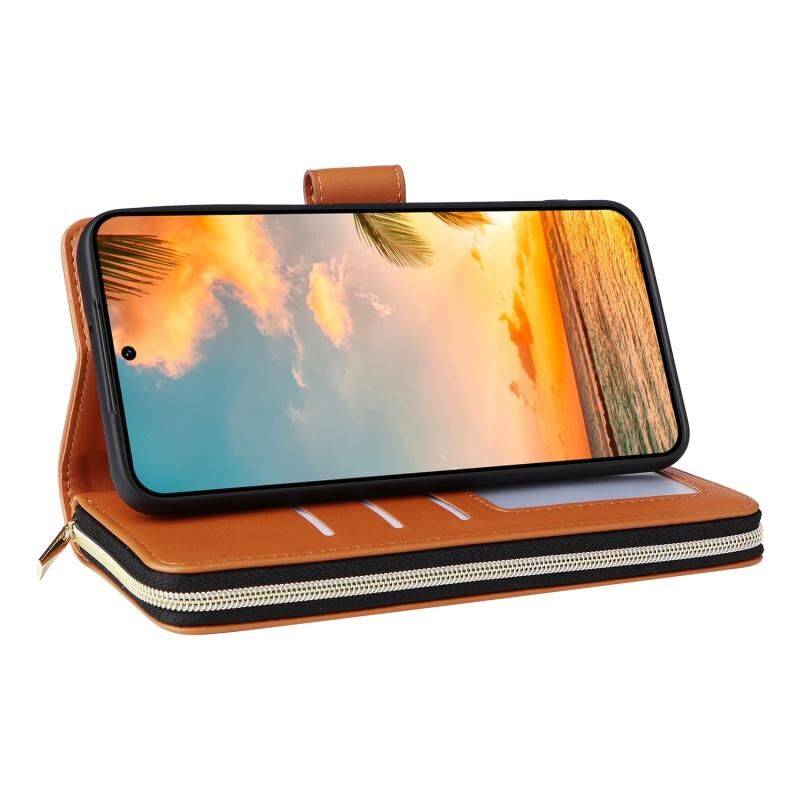 Για Samsung Galaxy S22 + 5G εννέα-κάρτα Slots φερμουάρ πορτοφόλι τσάντα δερμάτινη θήκη τηλεφώνου (καφέ)