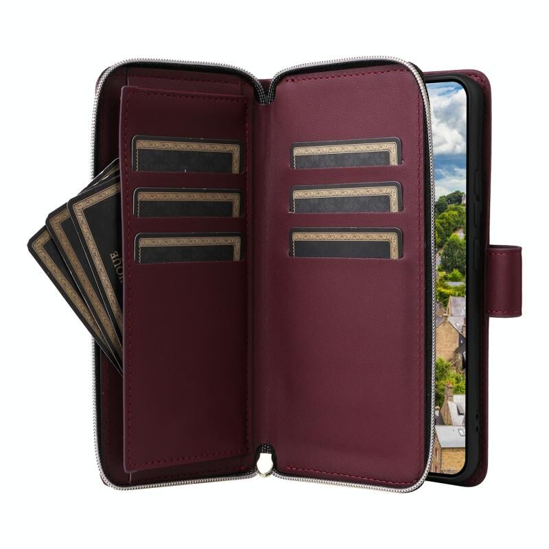 5. Πρακτική λειτουργία θήκης καρτών: Η υποδοχή κάρτας και η τσέπη πορτοφολιού με φερμουάρ και η θήκη μετρητών μπορούν να αποθηκεύσουν τις πιστωτικές σας κάρτες, τα μετρητά ή τα μικρά χαρτονομίσματα που χρειάζεστε καθημερινά.