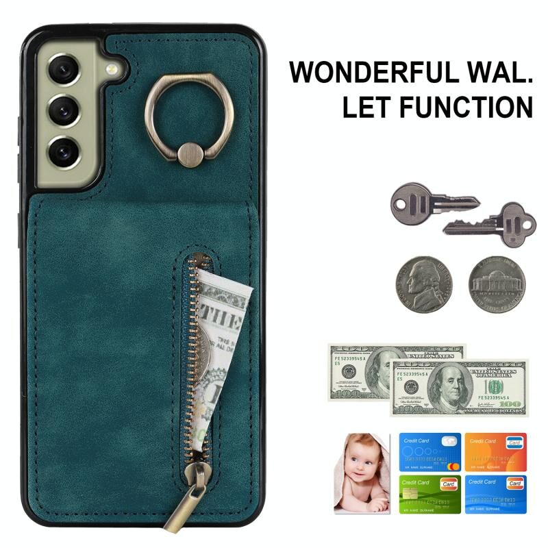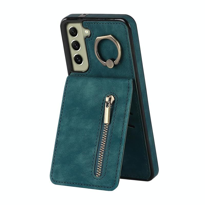Θήκη κινητού τηλεφώνου Samsung Galaxy S22+ 5G με ρετρό δακτύλιο και θήκη καρτών RFID με φερμουάρ (Μπλε)