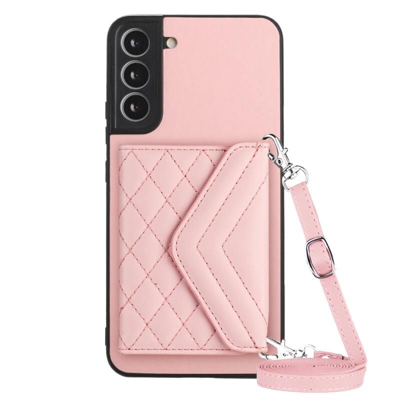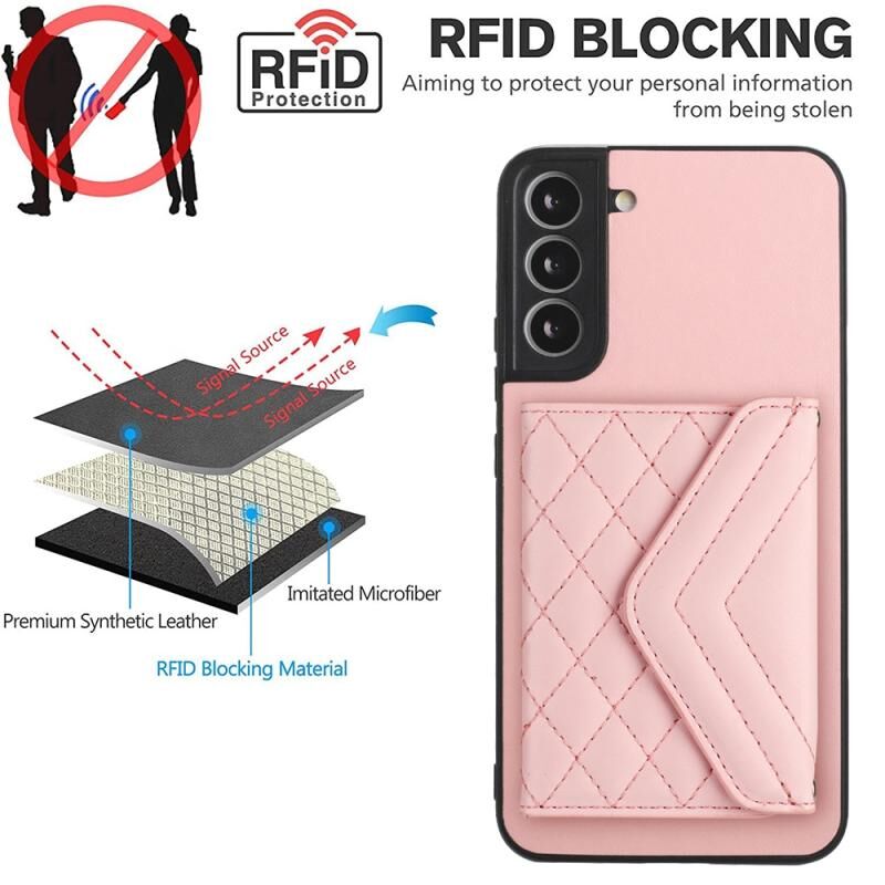 Για Samsung Galaxy S22 + 5G Rhombic υφή κάρτα τσάντα RFID υπόθεση τηλεφώνου με μακρύ κορδόνι (Rose Gold)