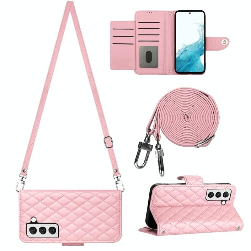Για Samsung Galaxy S22+ 5G Rhombic υφή Flip δερμάτινη θήκη τηλεφώνου με μακρύ κορδόνι (ροζ)