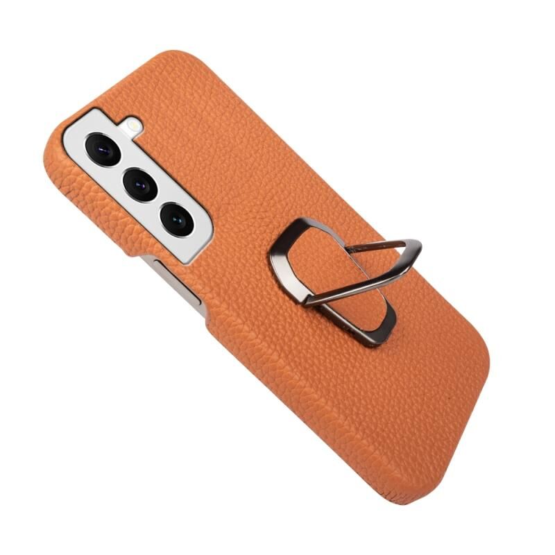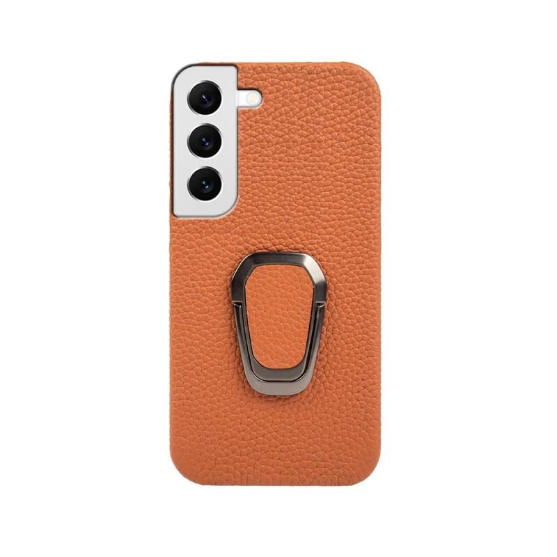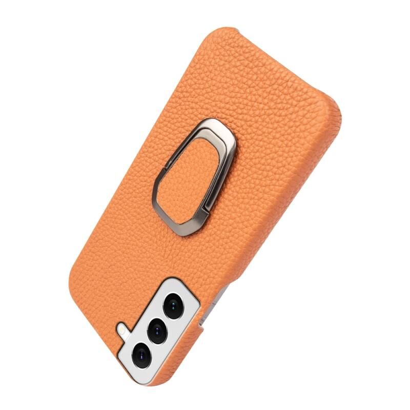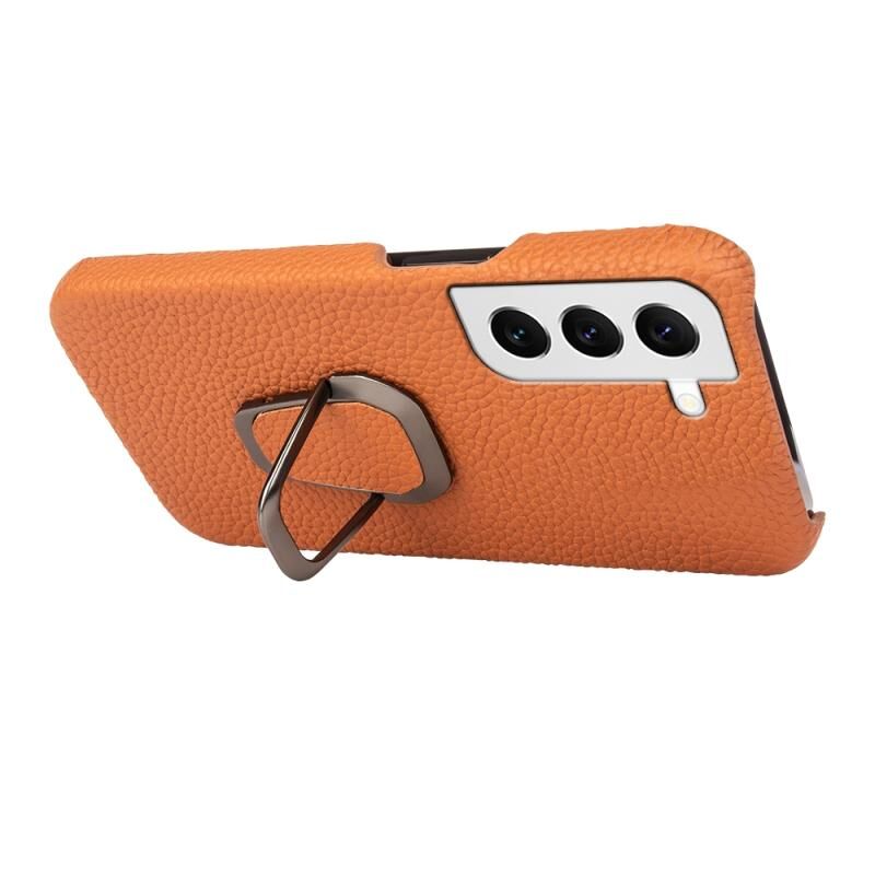 Θήκη κινητού τηλεφώνου Samsung Galaxy S22 5G με δακτύλιο και γνήσιο δέρμα υφής λύτσι (Μαύρο)