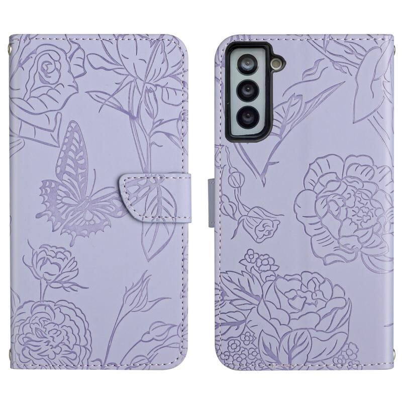 Θήκη τηλεφώνου Samsung Galaxy S22+ 5G από δέρμα με ανάγλυφο σχέδιο πεταλούδας και παιώνιας (Ροζ)