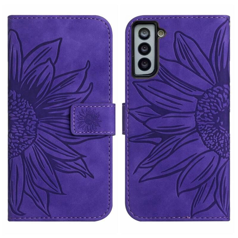 Για το Samsung Galaxy S22 + 5G δέρμα αίσθηση Sun Flower μοτίβο Flip δέρμα τηλέφωνο υπόθεση με κορδόνι (σκούρο μωβ)