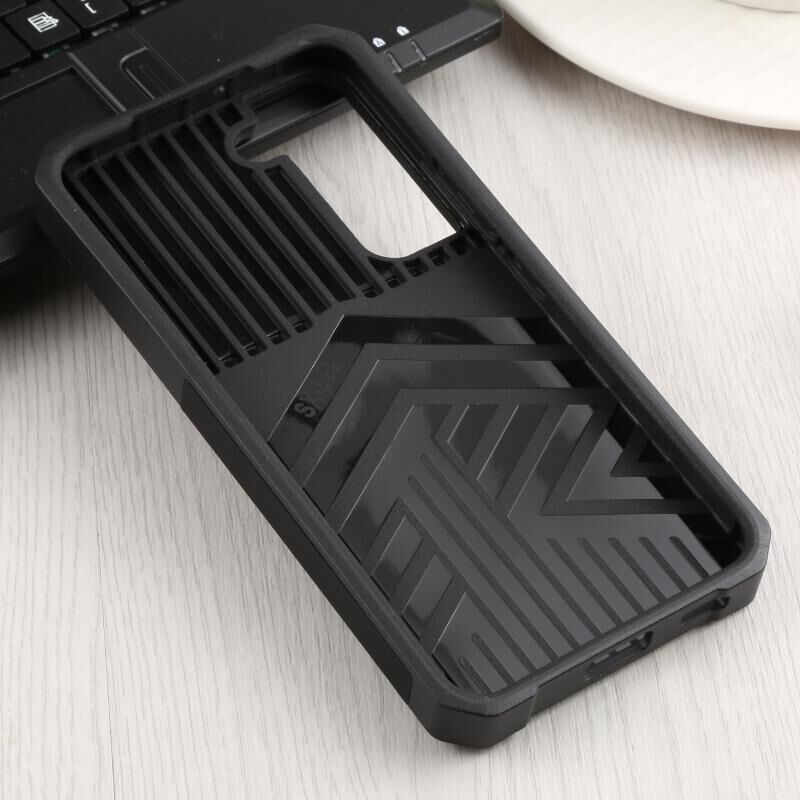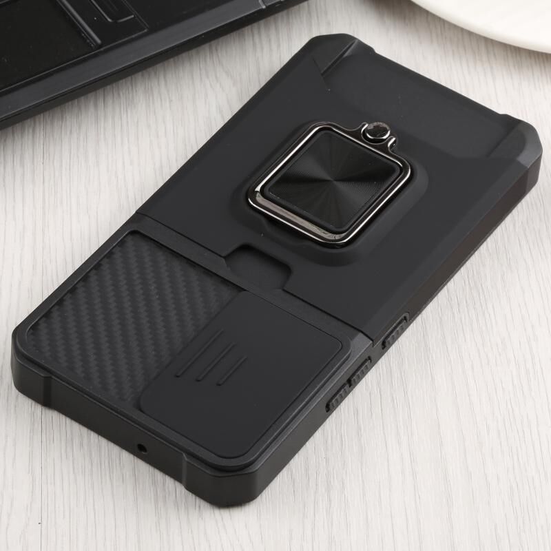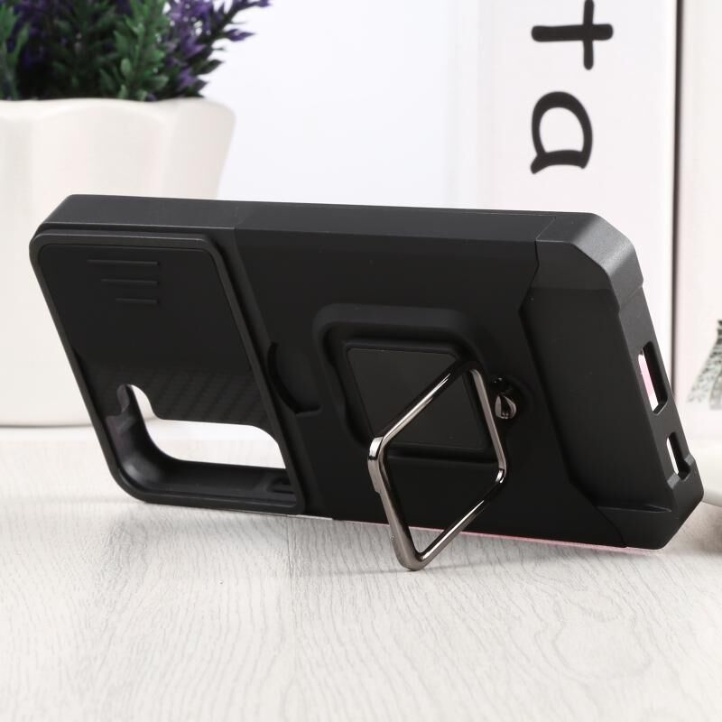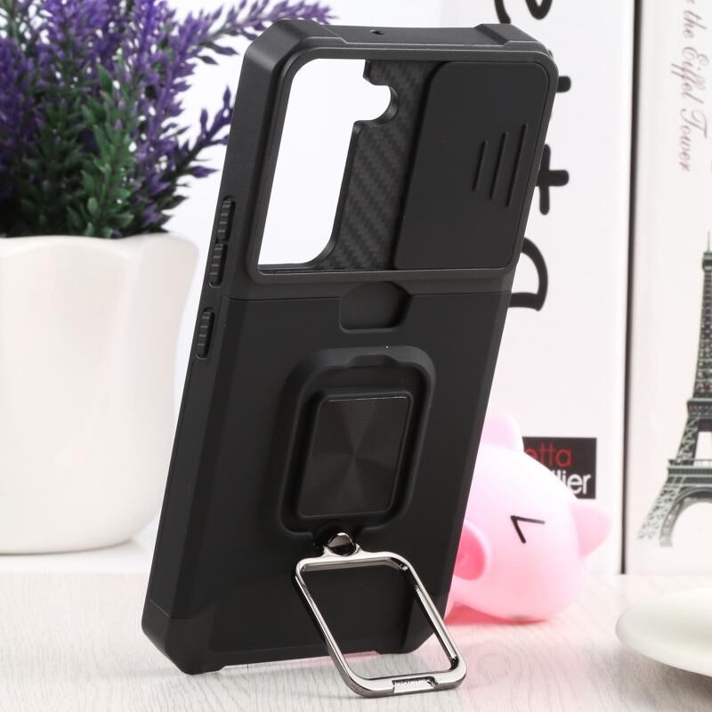 Για Samsung Galaxy S22 5G συρόμενη κάμερα Cover Design PC + TPU Shockproof τηλέφωνο υπόθεση με θήκη δαχτυλίδι & υποδοχή κάρτας (μαύρο)