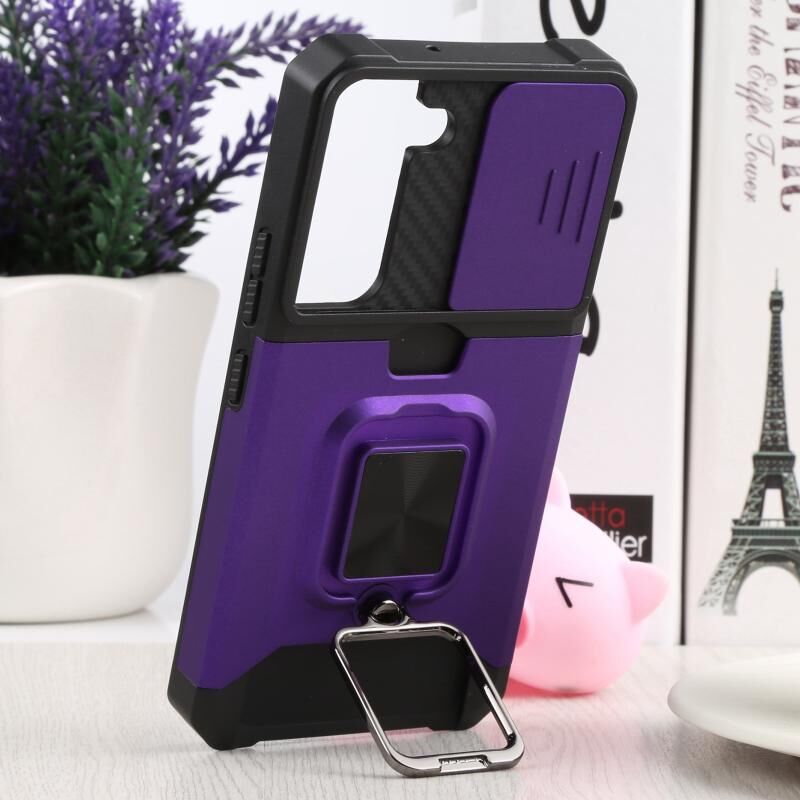 Για Samsung Galaxy S22 5G συρόμενη κάμερα Cover Design PC + TPU Shockproof τηλέφωνο υπόθεση με θήκη δαχτυλίδι & υποδοχή κάρτας (μωβ)