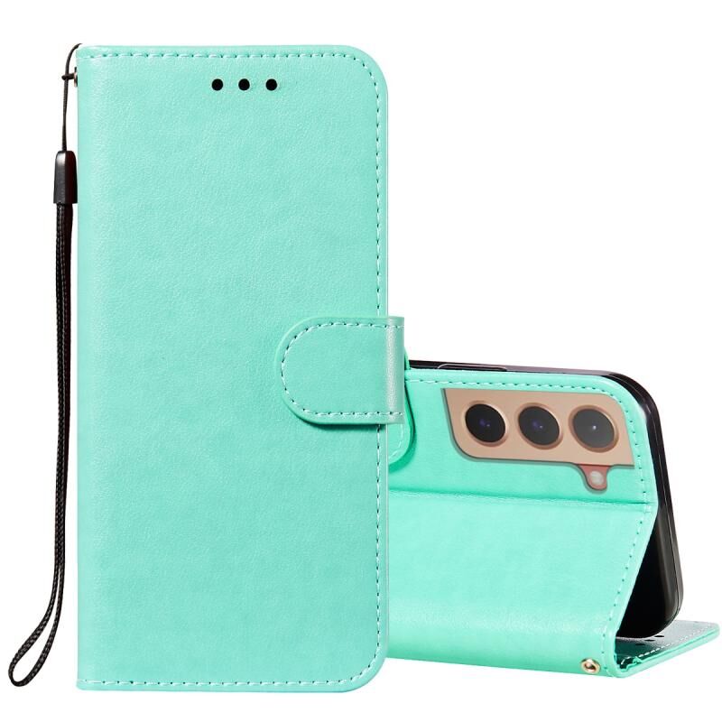 Για Samsung Galaxy S22 5G Αμιγές χρώμα δερμάτινη θήκη τηλεφώνου με θήκη & υποδοχές για κάρτες & πορτοφόλι & κορδόνι (πράσινο)