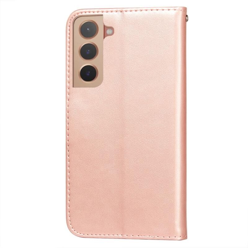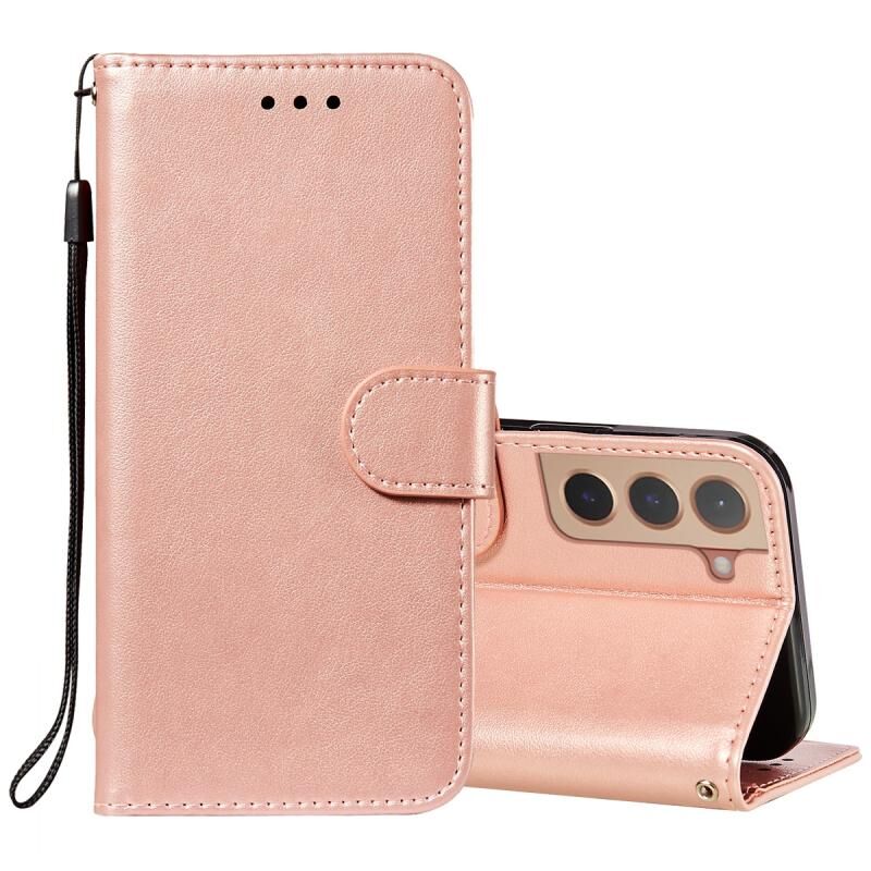 Για Samsung Galaxy S22+ 5G Αμιγές χρώμα δερμάτινη θήκη τηλεφώνου με θήκη & υποδοχές για κάρτες & πορτοφόλι & κορδόνι (ροζ χρυσό)