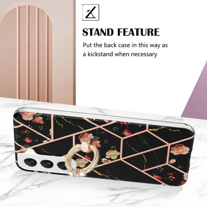 Θήκη για Samsung Galaxy S22 5G, με σχέδιο μαρμάρου και λουλουδιών σε στυλ patchwork, από TPU με δακτύλιο στήριξης (Ροζ Λουλούδι)