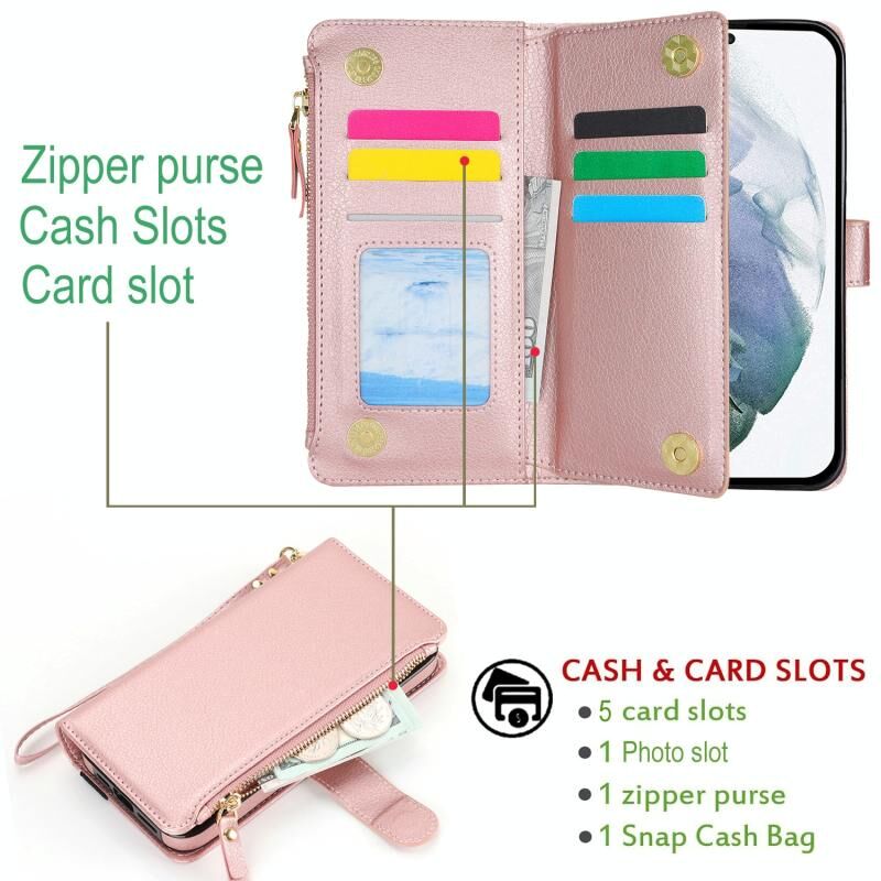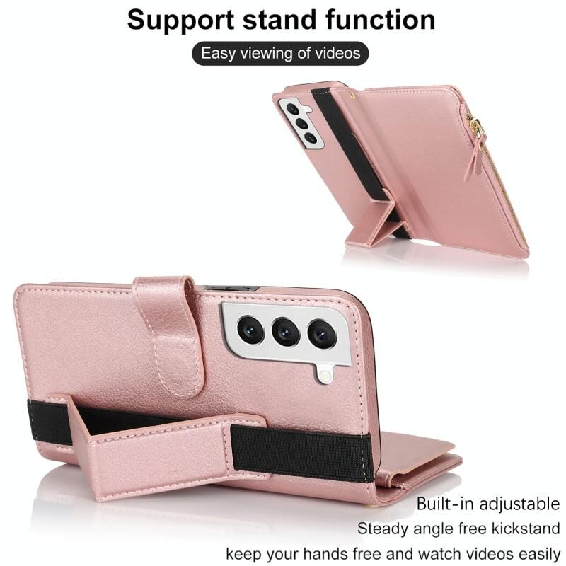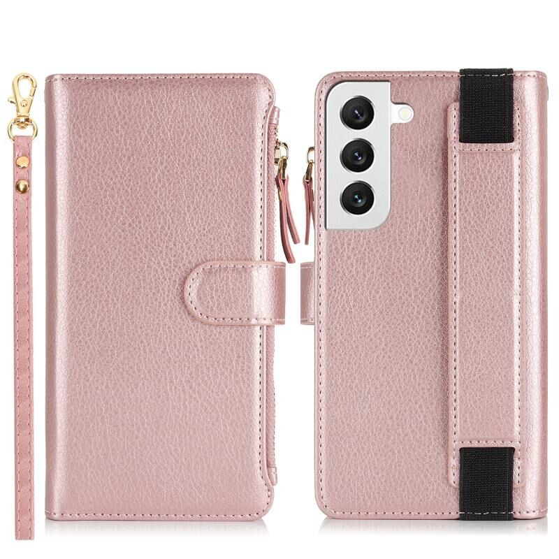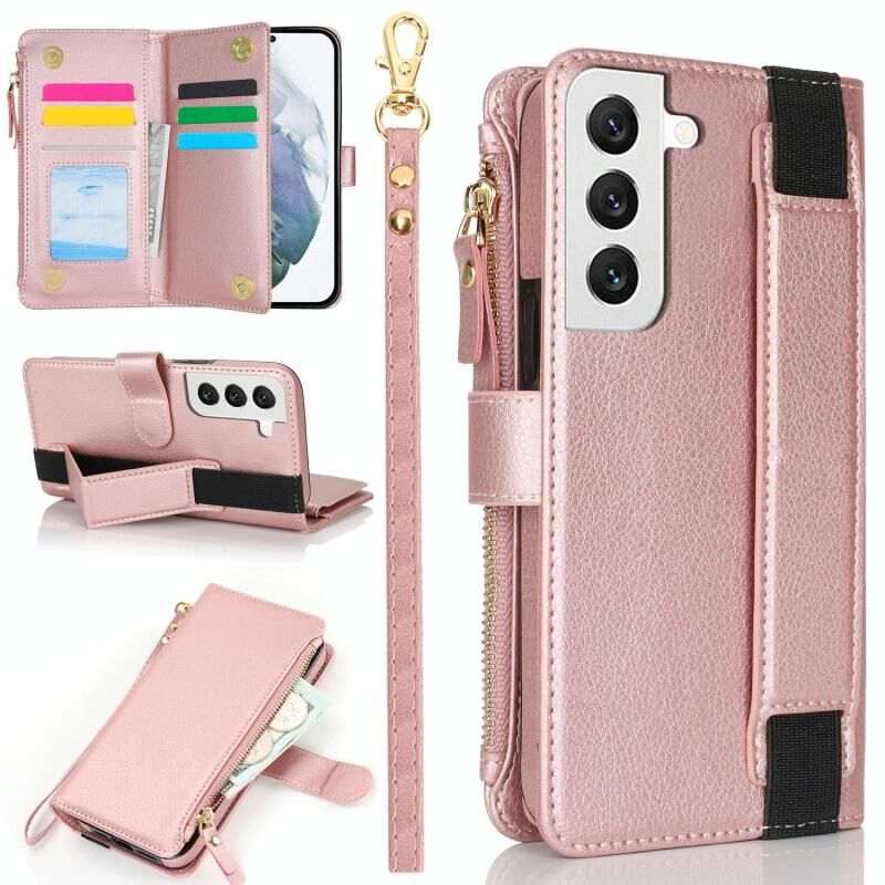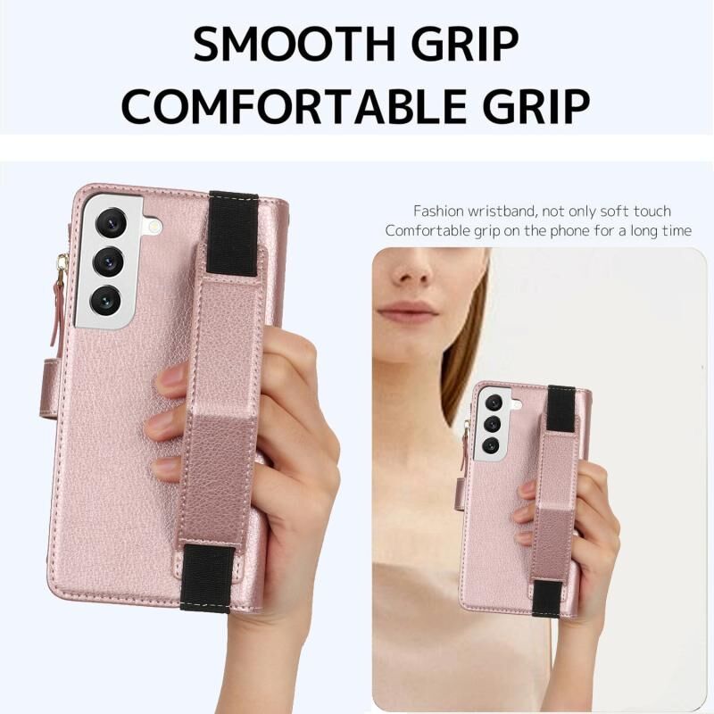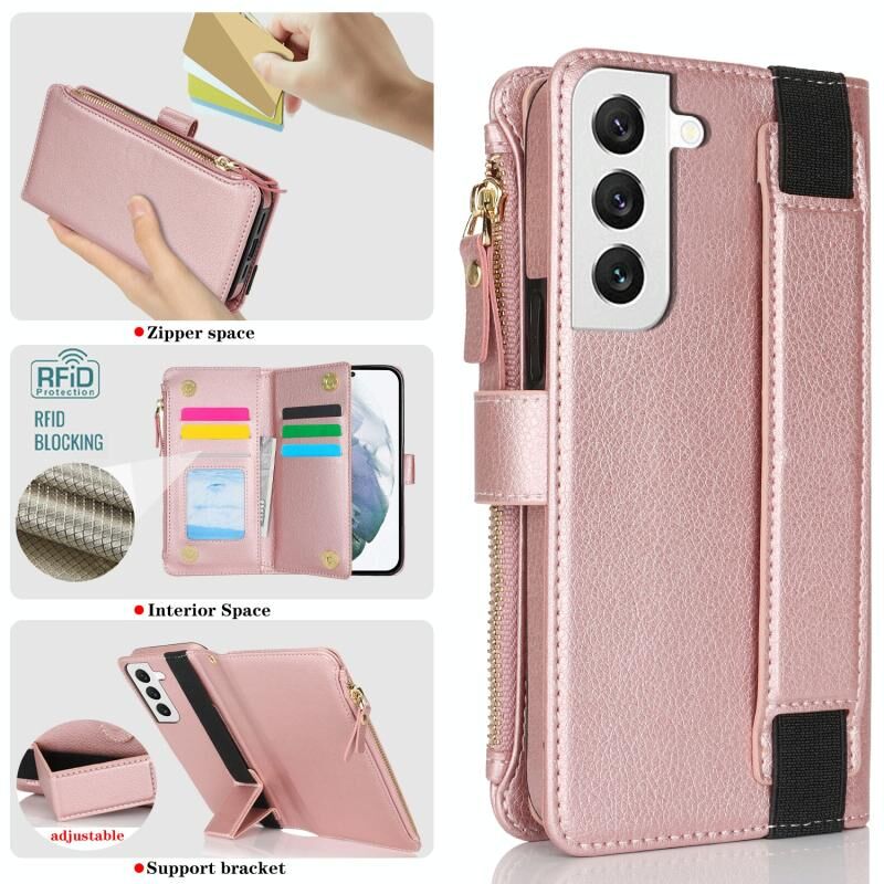 Για Samsung Galaxy S22 5G Wristband κάτοχος φερμουάρ πορτοφόλι RFID δερμάτινη θήκη τηλεφώνου (Rose Gold)