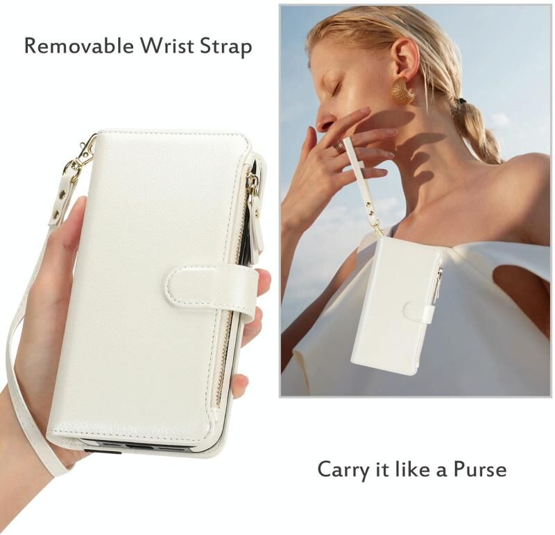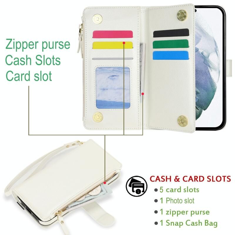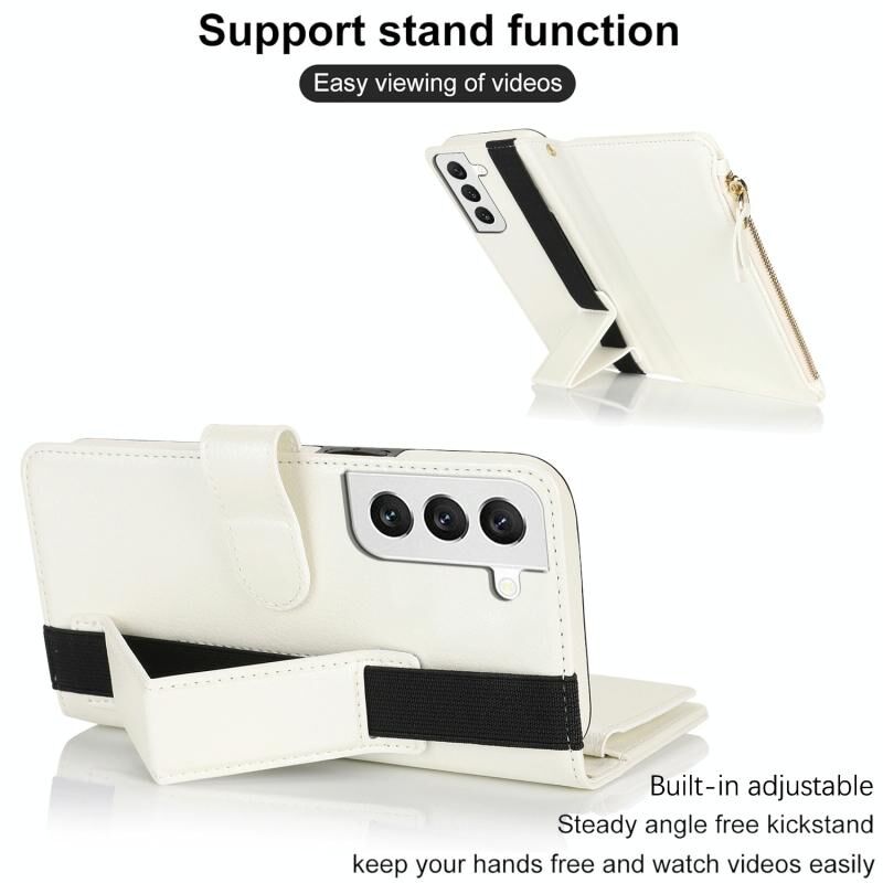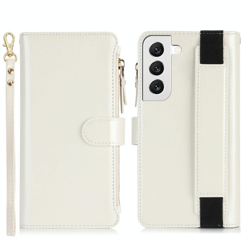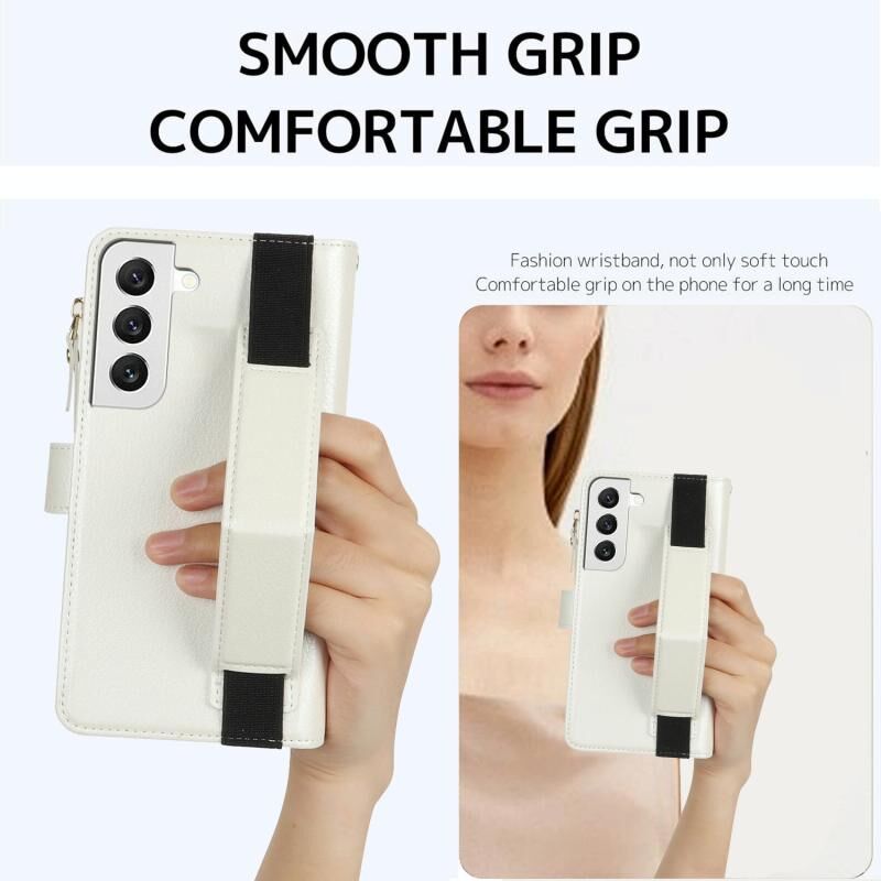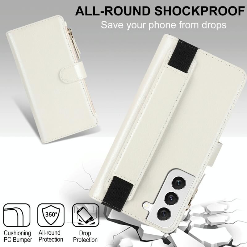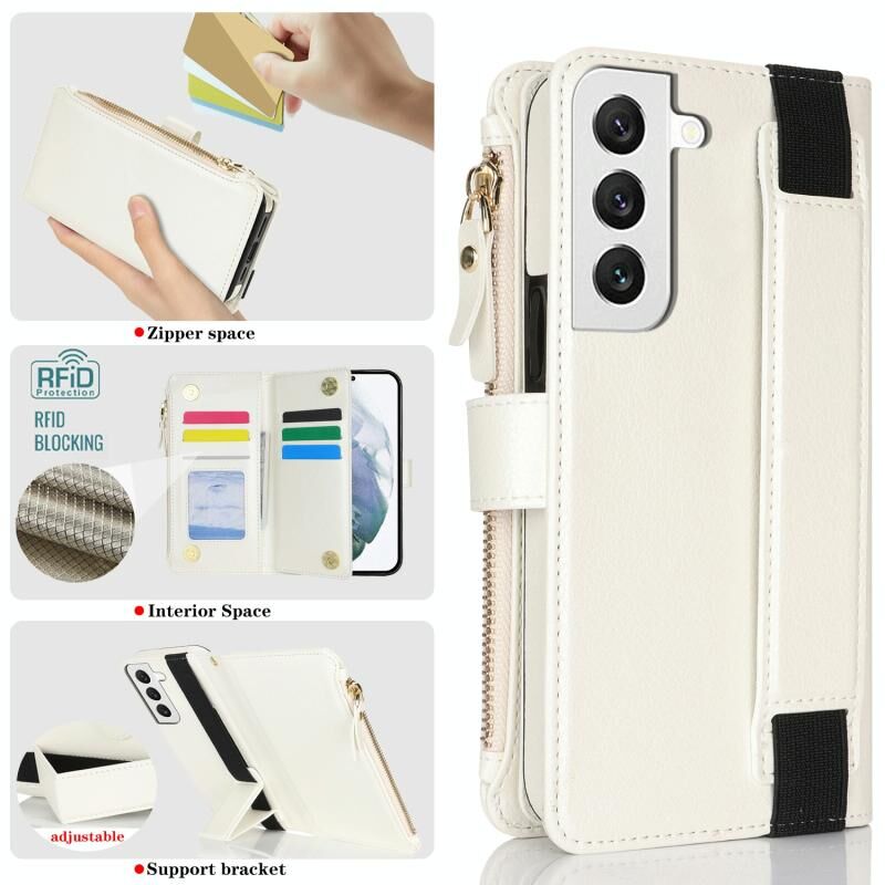 Για Samsung Galaxy S22 + 5G Wristband κάτοχος φερμουάρ πορτοφόλι RFID δερμάτινη θήκη τηλεφώνου (Λευκό)