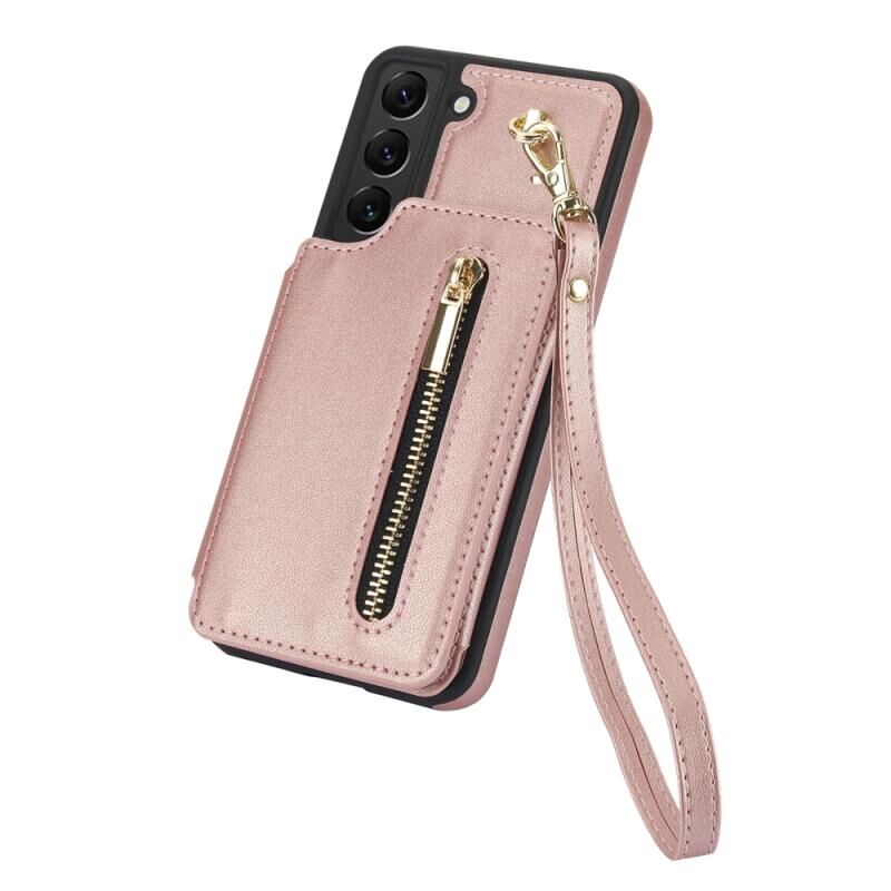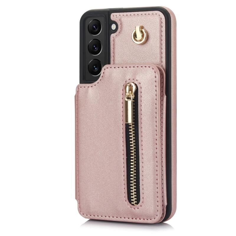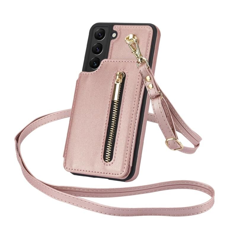 Για Samsung Galaxy S22 5G YM006 δέρμα αίσθηση φερμουάρ κάρτα τσάντα υπόθεση τηλεφώνου με διπλό κορδόνι (Rose Gold)