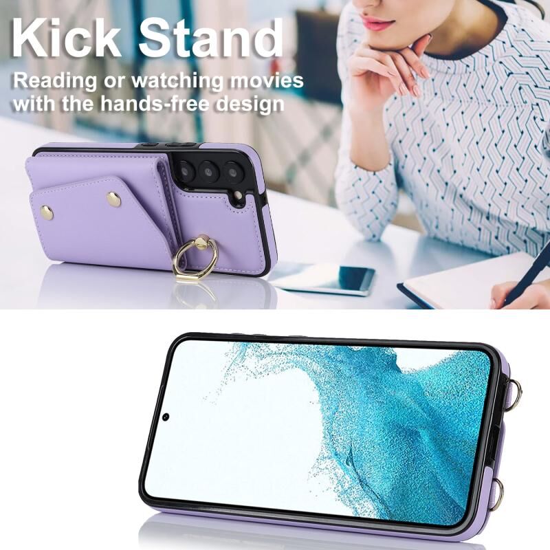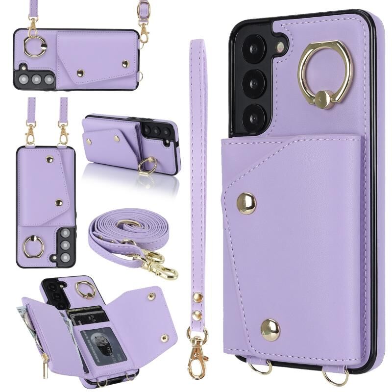 Για Samsung Galaxy S22 5G φερμουάρ τσάντα κάρτα τηλέφωνο υπόθεση με διπλό κορδόνι (μωβ)