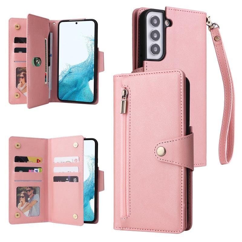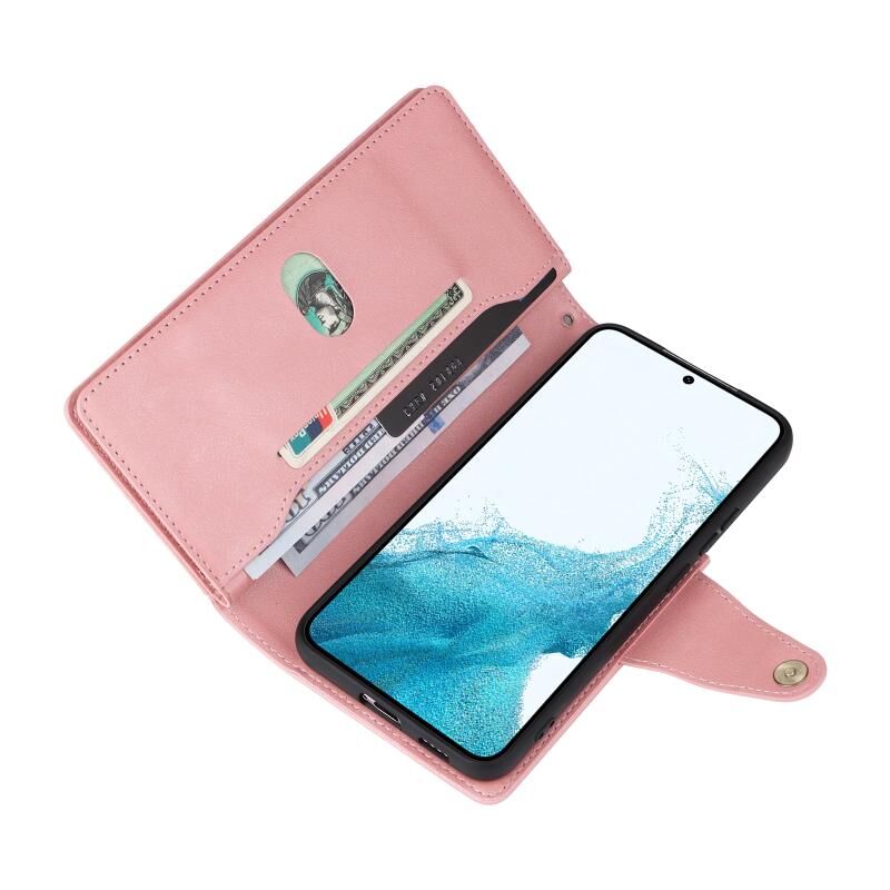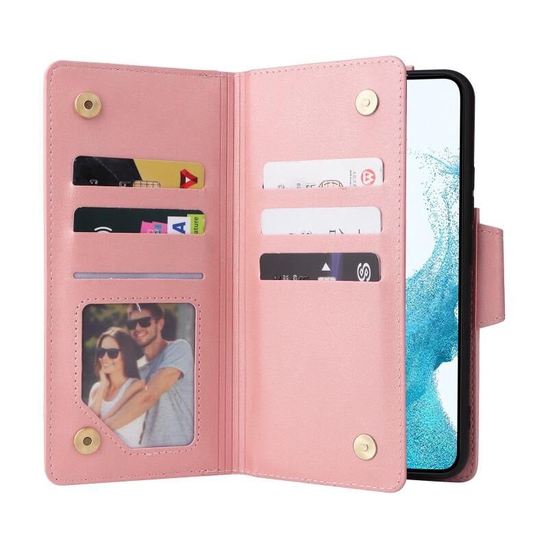Για Samsung Galaxy S22 Rivet πόρπη 9 κάρτες τρεις φορές δερμάτινη θήκη τηλεφώνου (Rose Gold)