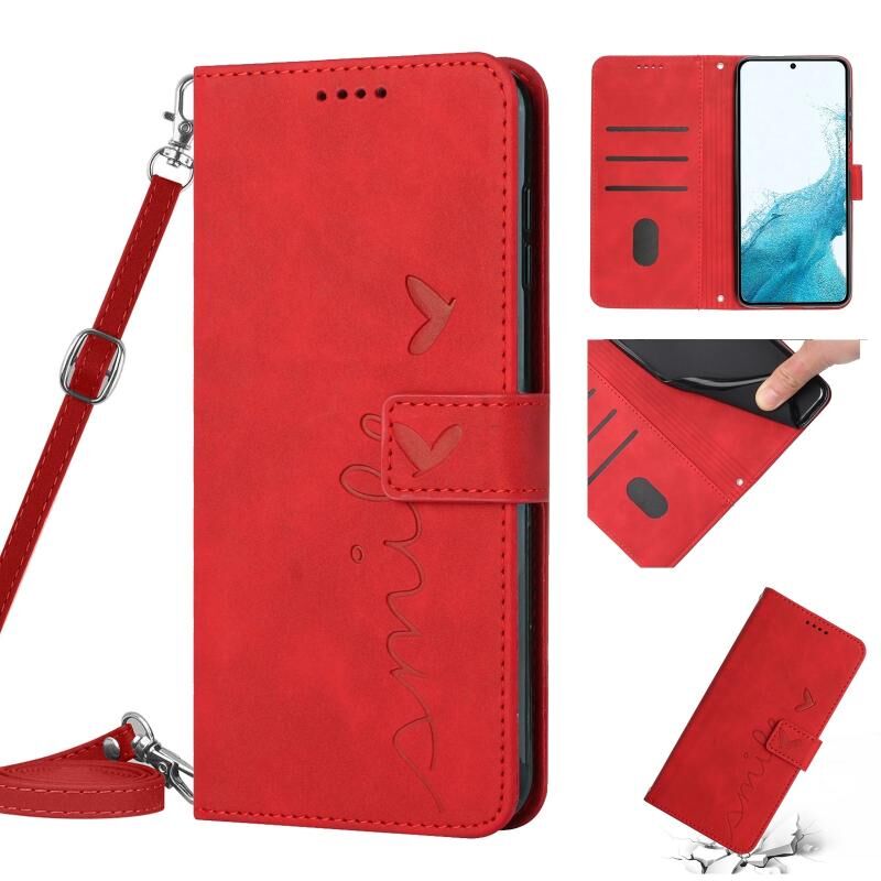 Για Samsung Galaxy S22 δέρμα αίσθηση καρδιά μοτίβο δερμάτινη θήκη τηλεφώνου με κορδόνι (κόκκινο)