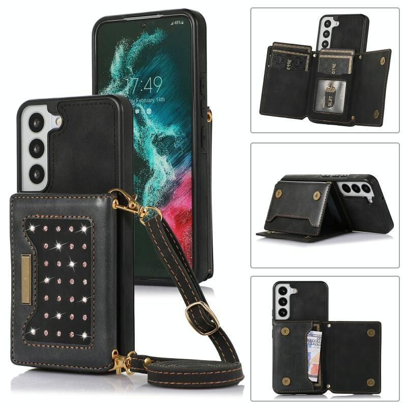 Για Samsung Galaxy S22 Τρεις-πτυχής RFID δερμάτινη θήκη τηλεφώνου με κορδόνι (Μαύρο)