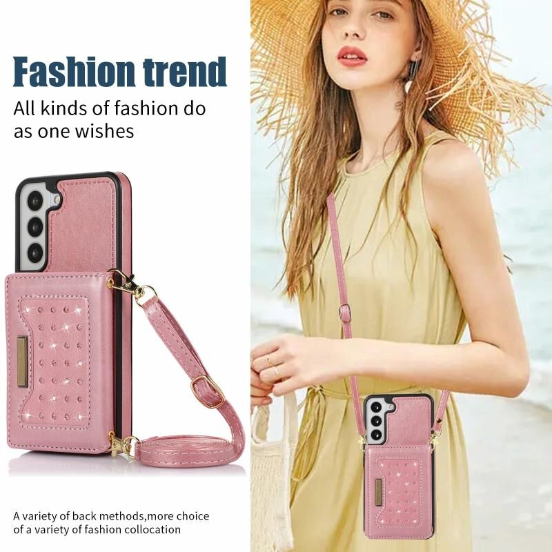 Για Samsung Galaxy S22 Τρεις φορές RFID δερμάτινη θήκη τηλεφώνου με κορδόνι (ροζ χρυσό)