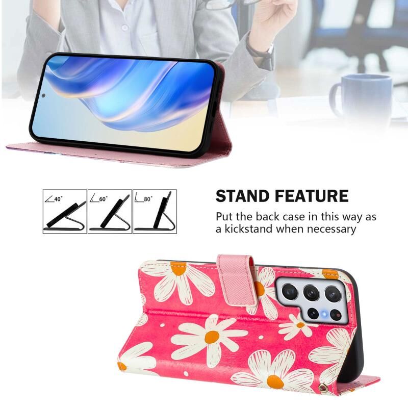 For Samsung Galaxy S22 Ultra 5G Art Colored Drawing Pattern Leather Phone Case(Pink daisy)