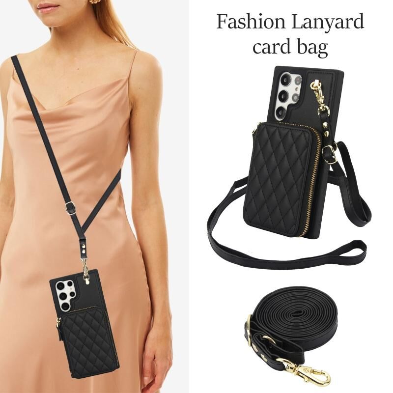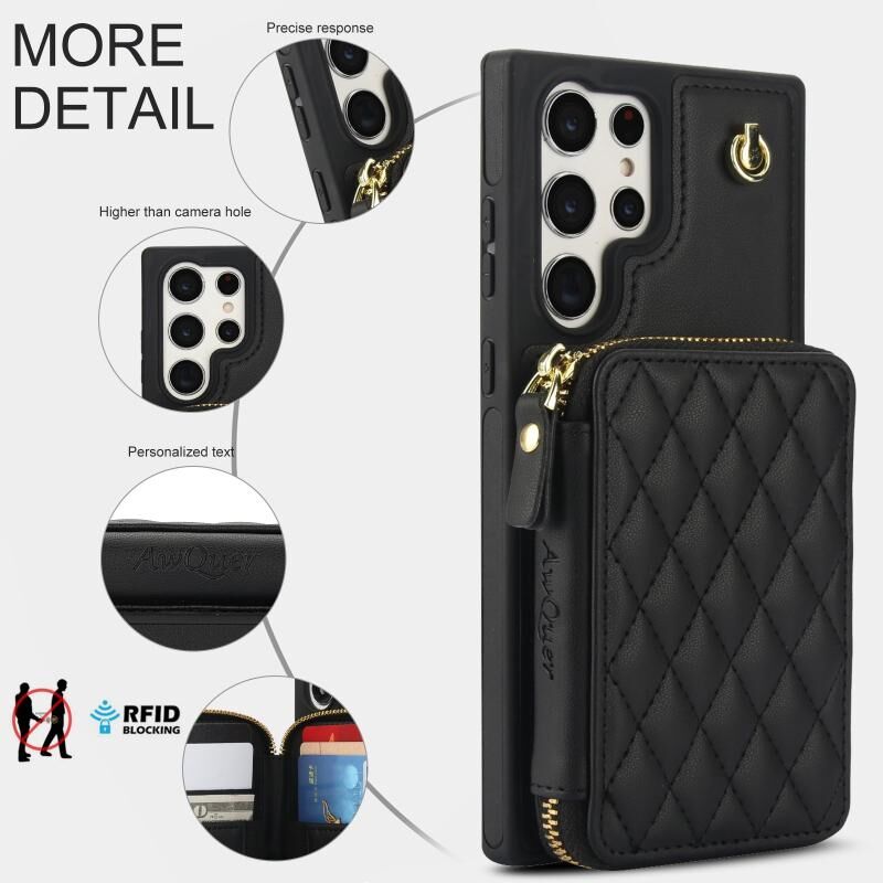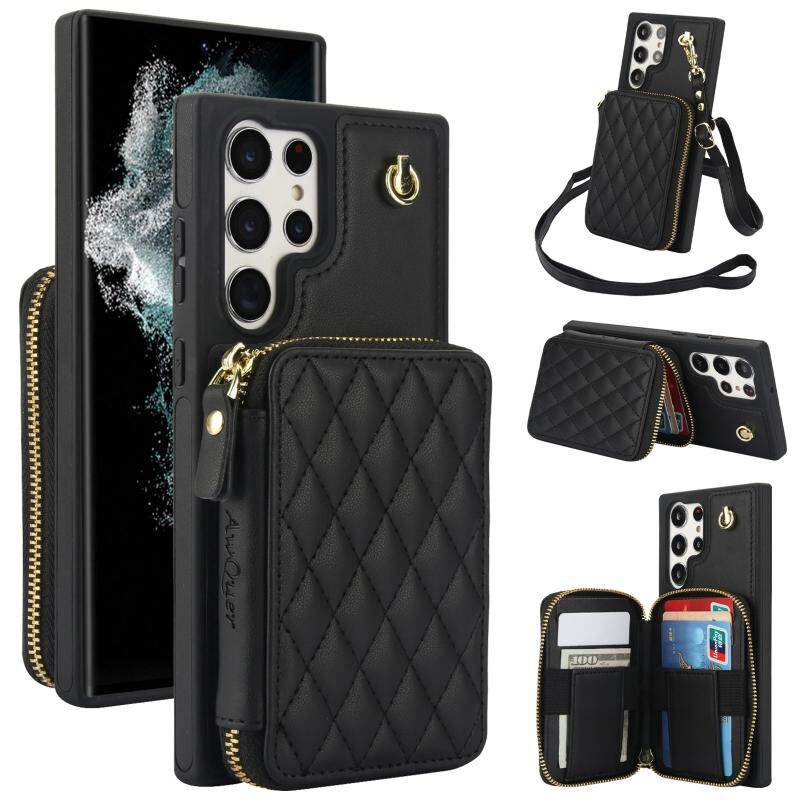 Θήκη κινητού τηλεφώνου για Samsung Galaxy S22 Ultra 5G AwQuer, διαγώνια, δερμάτινη, με φερμουάρ και λουρί στον ώμο (Μαύρο) (Awquer)