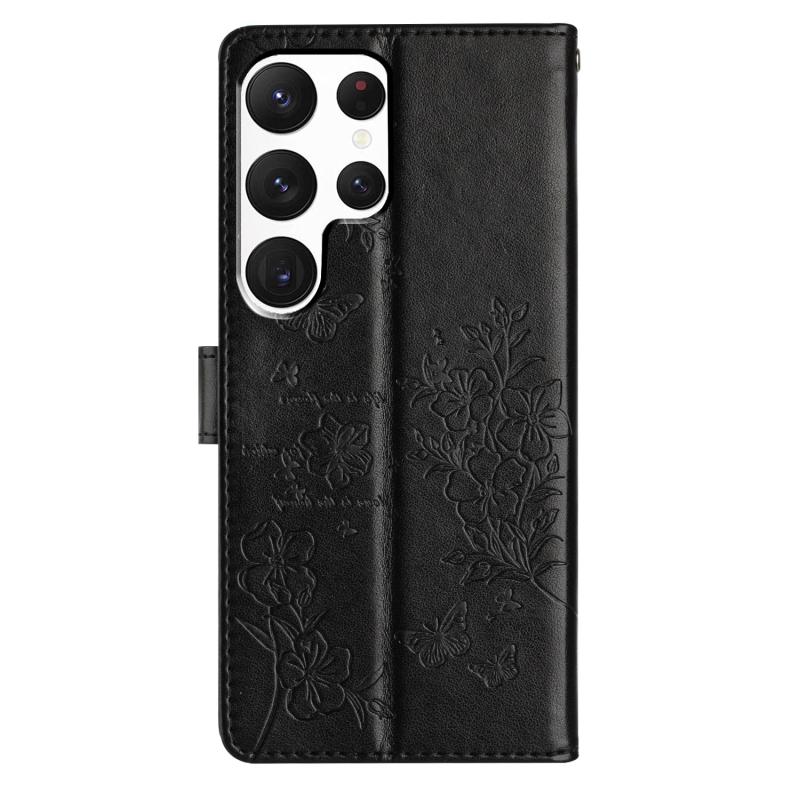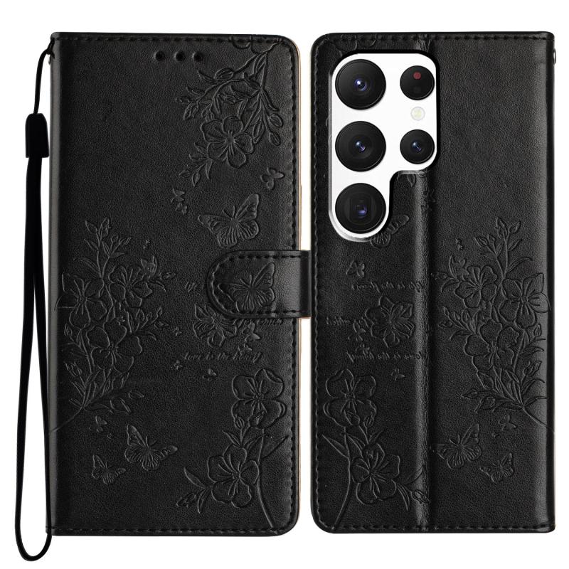For Samsung Galaxy S22 Ultra 5G Butterflies and Flowers Leather Phone Case(Black)
