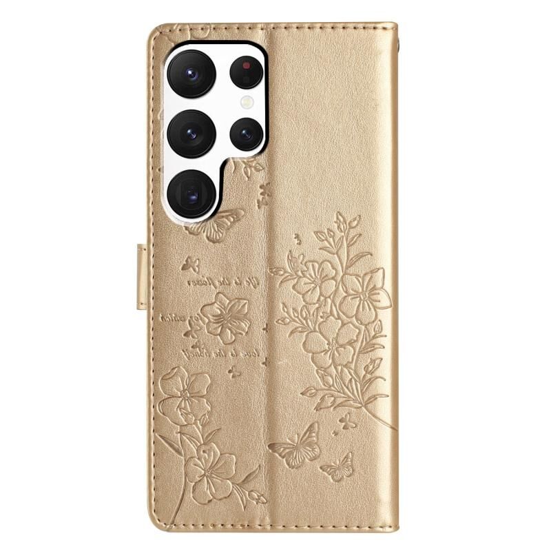 For Samsung Galaxy S22 Ultra 5G Butterflies and Flowers Leather Phone Case(Gold)