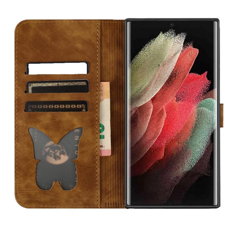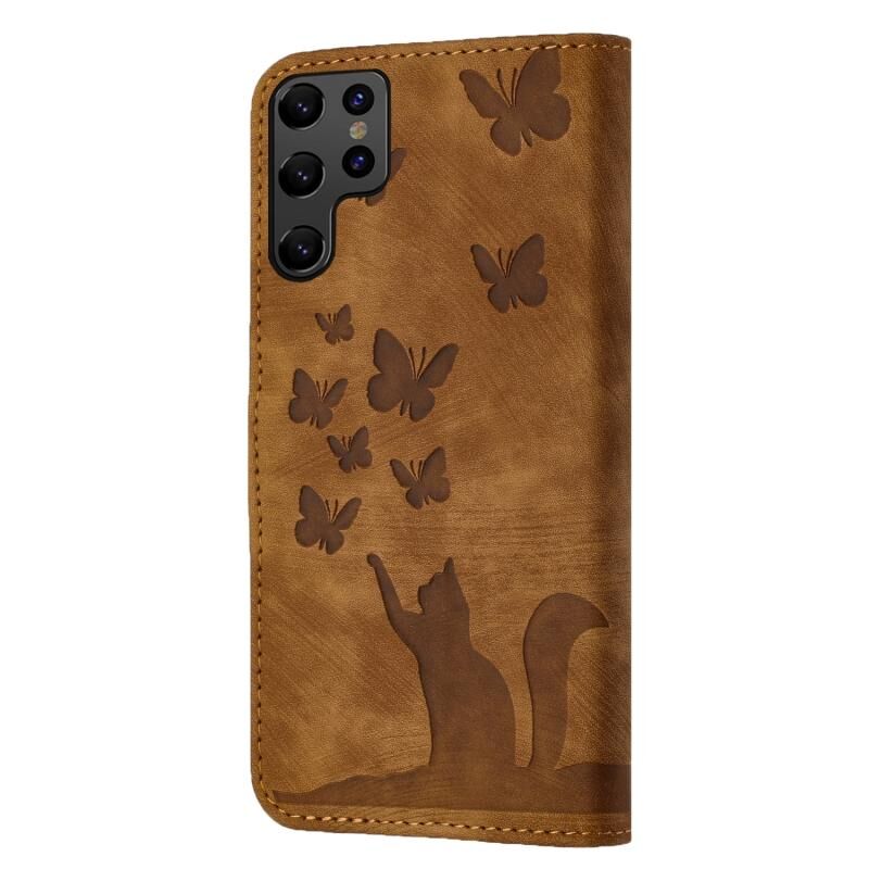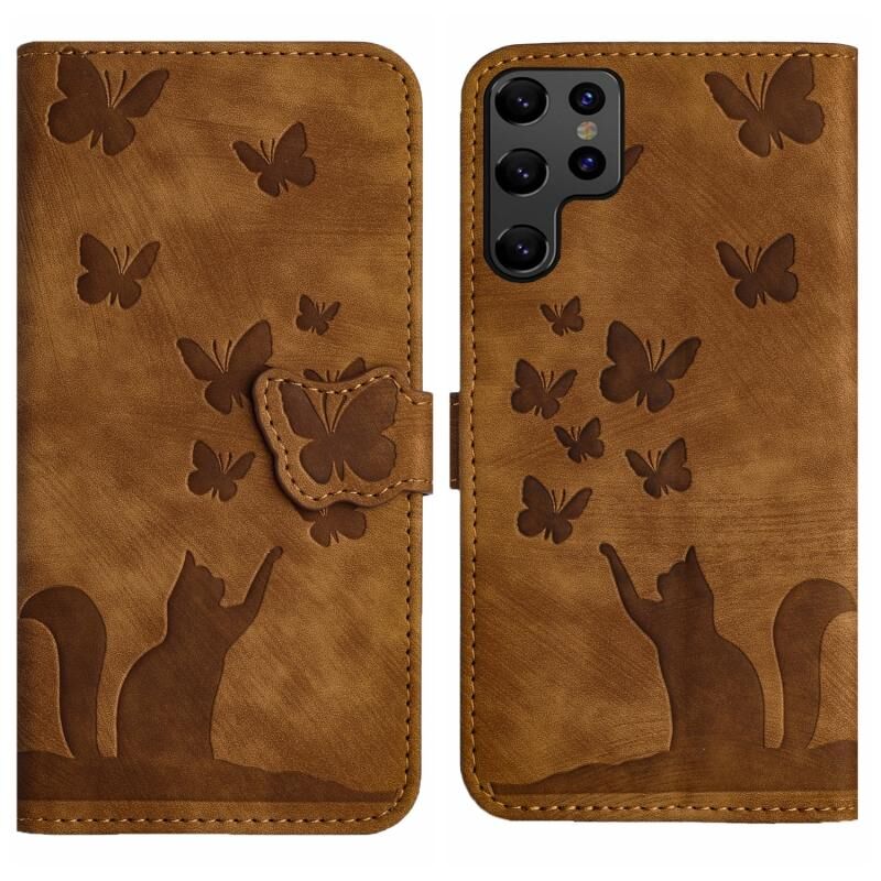 Θήκη τηλεφώνου Samsung Galaxy S22 Ultra 5G, δερμάτινη, τύπου flip, με ανάγλυφο σχέδιο πεταλούδας και γάτας (Καφέ)