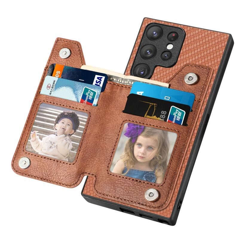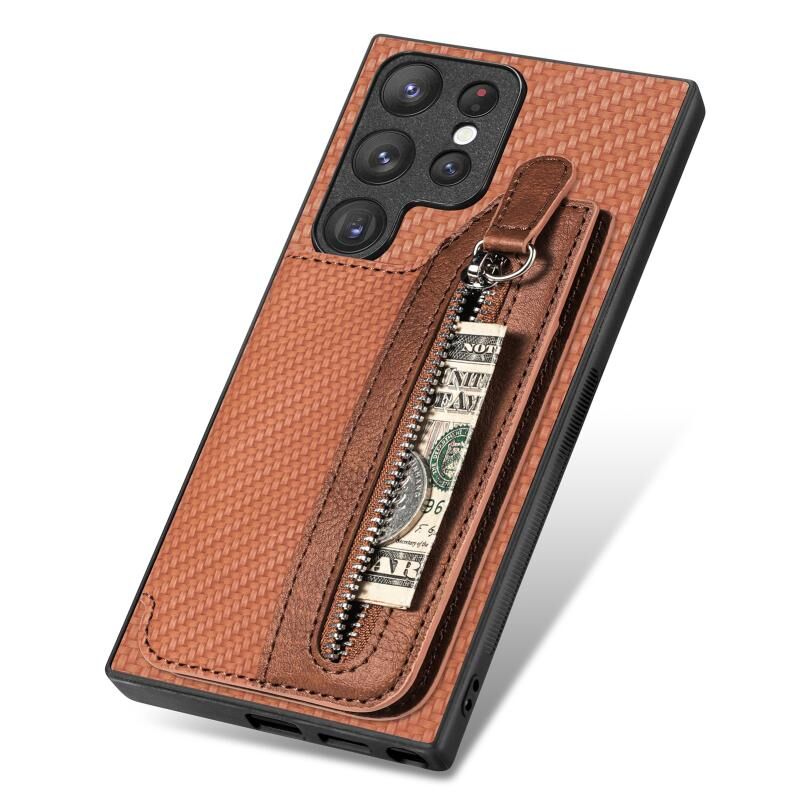 Για Samsung Galaxy S22 Ultra 5G Carbon Fiber οριζόντια Flip φερμουάρ πορτοφόλι υπόθεση τηλεφώνου (καφέ)