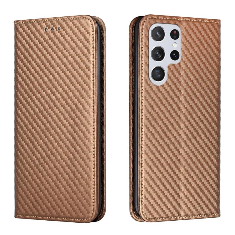 For Samsung Galaxy S22 Ultra 5G Carbon Fiber Texture Flip Holder Leather Phone Case(Brown)