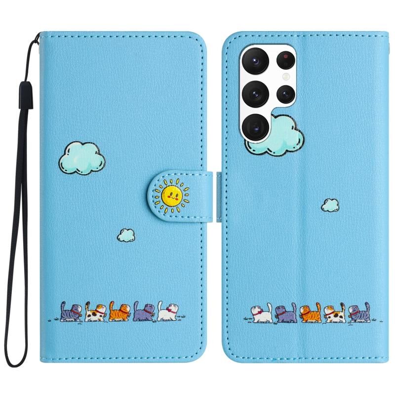 Θήκη τηλεφώνου Samsung Galaxy S22 Ultra 5G από δέρμα με σχέδια καρτούν γάτας (Μπλε)