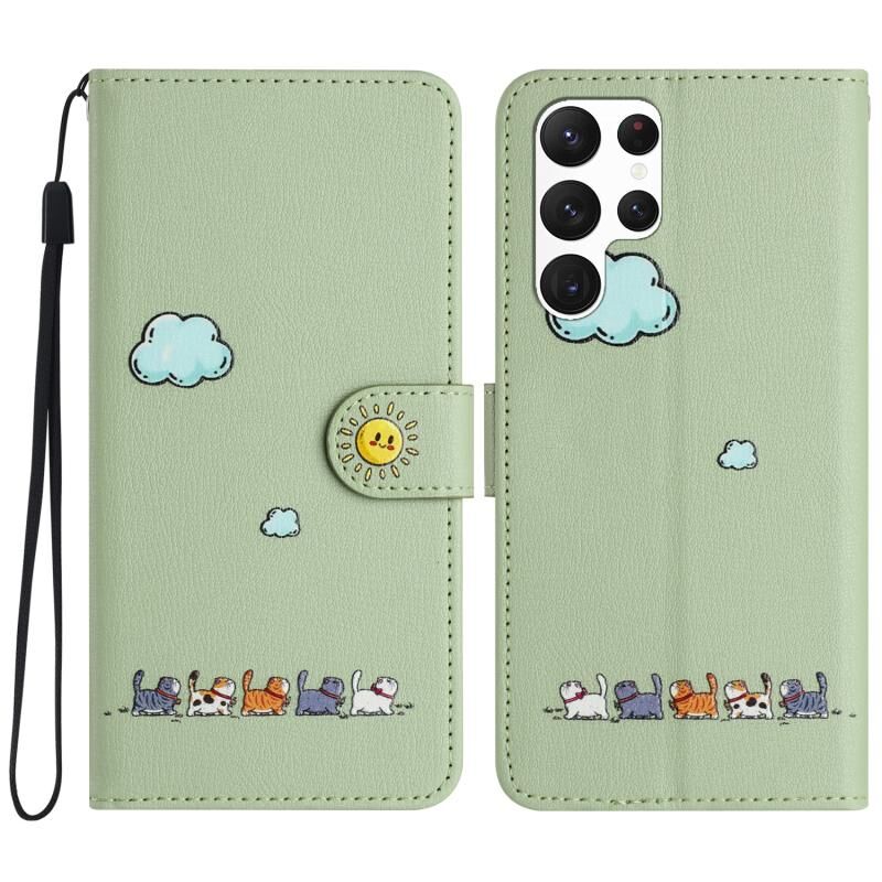Θήκη τηλεφώνου Samsung Galaxy S22 Ultra 5G από δέρμα με σχέδια καρτούν γάτας (Μπλε)