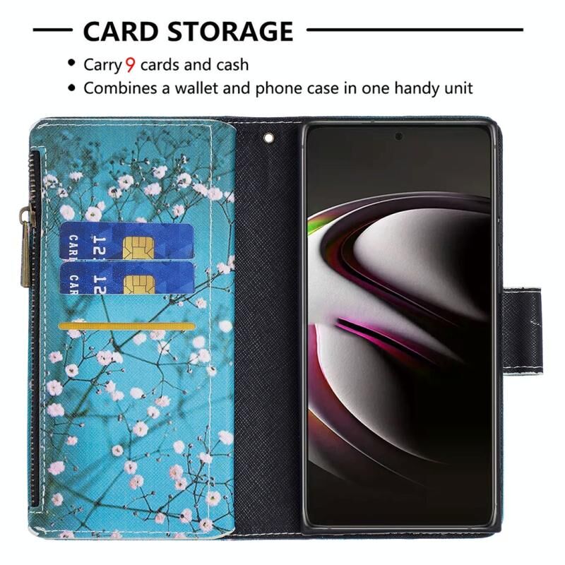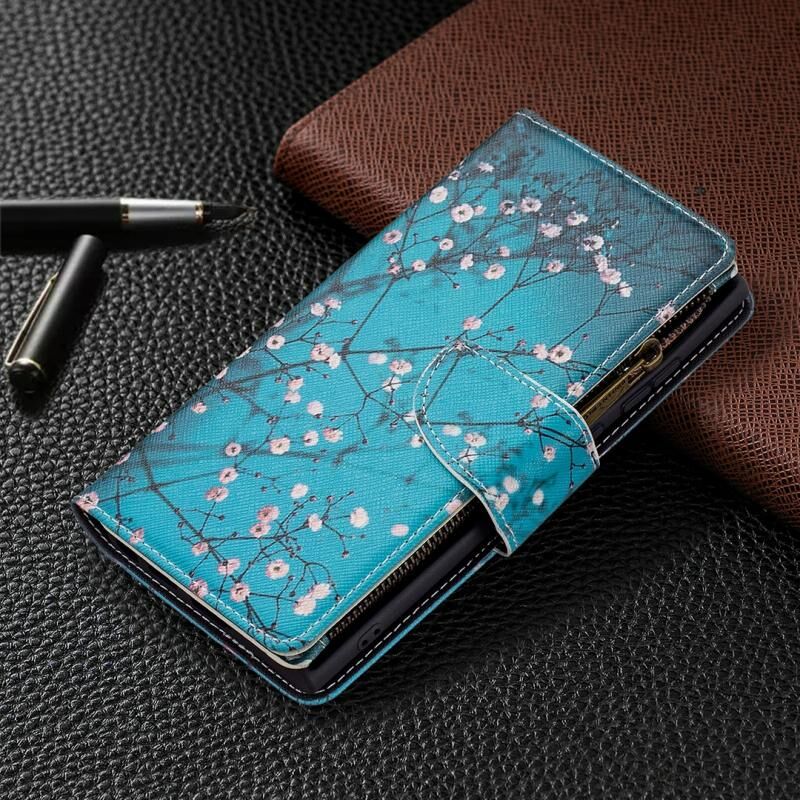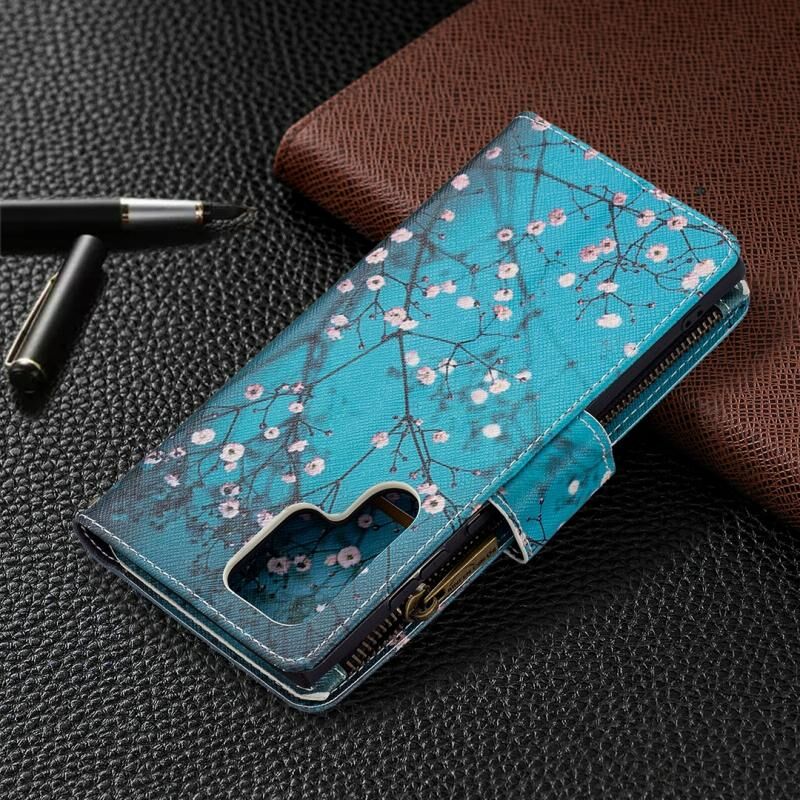 Θήκη τηλεφώνου Samsung Galaxy S22 Ultra 5G από δέρμα με οριζόντιο άνοιγμα, φερμουάρ, σχέδιο ζωγραφικής σε χρώμα βουκαμβίλιας, με βάση & θήκες για κάρτες & πορτοφόλι.