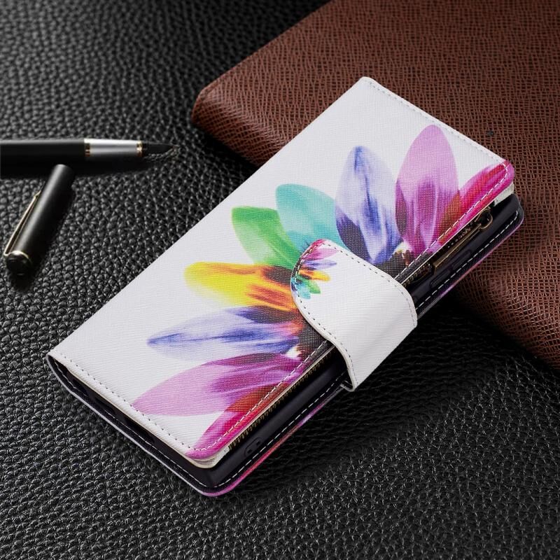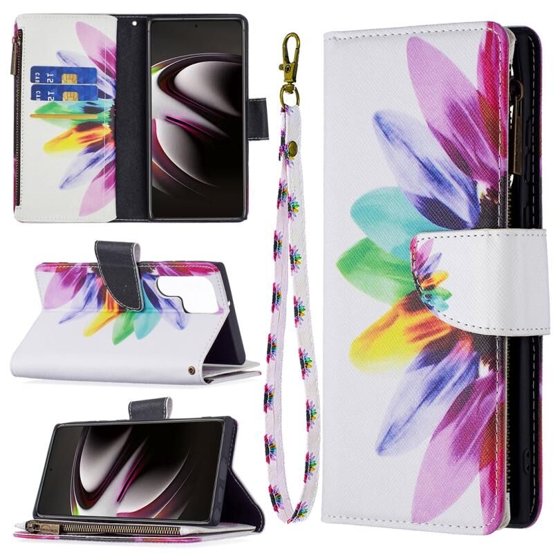 Θήκη τηλεφώνου Samsung Galaxy S22 Ultra 5G από δέρμα με οριζόντιο άνοιγμα, φερμουάρ, πολύχρωμο σχέδιο, με βάση & θήκες για κάρτες & πορτοφόλι (Ηλίανθος)