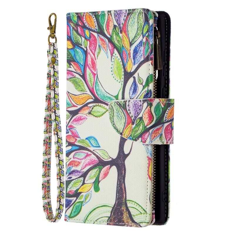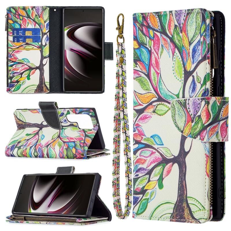 Θήκη δέρματος οριζόντιας αναδίπλωσης για Samsung Galaxy S22 Ultra 5G με σχέδιο έγχρωμης ζωγραφικής και φερμουάρ, με βάση & υποδοχές καρτών & πορτοφόλι (Δέντρο)
