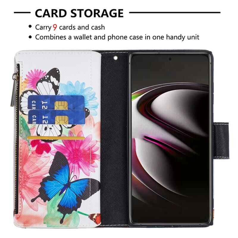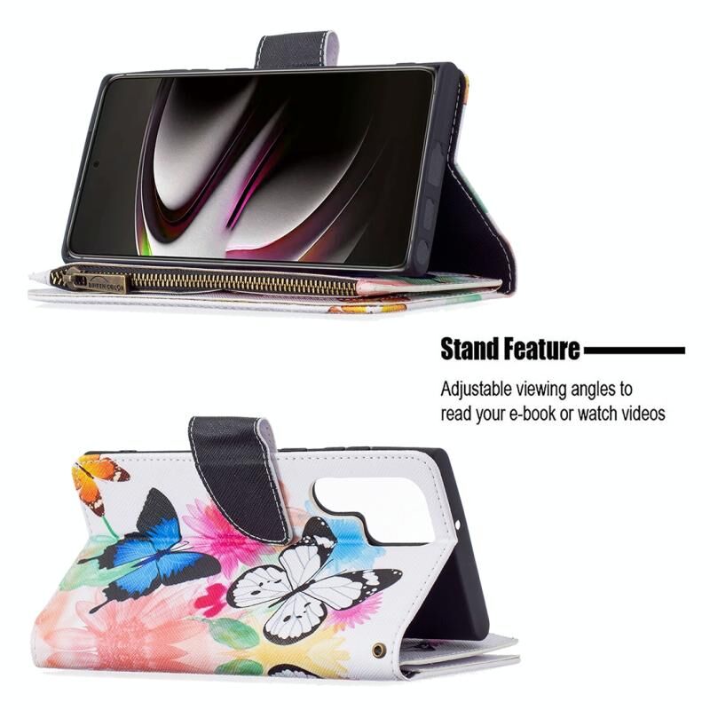 Θήκη τηλεφώνου Samsung Galaxy S22 Ultra 5G από δέρμα με οριζόντιο άνοιγμα, φερμουάρ, σχέδιο ζωγραφικής με χρώματα και θήκη, υποδοχές για κάρτες και πορτοφόλι (Δύο Πεταλούδες).