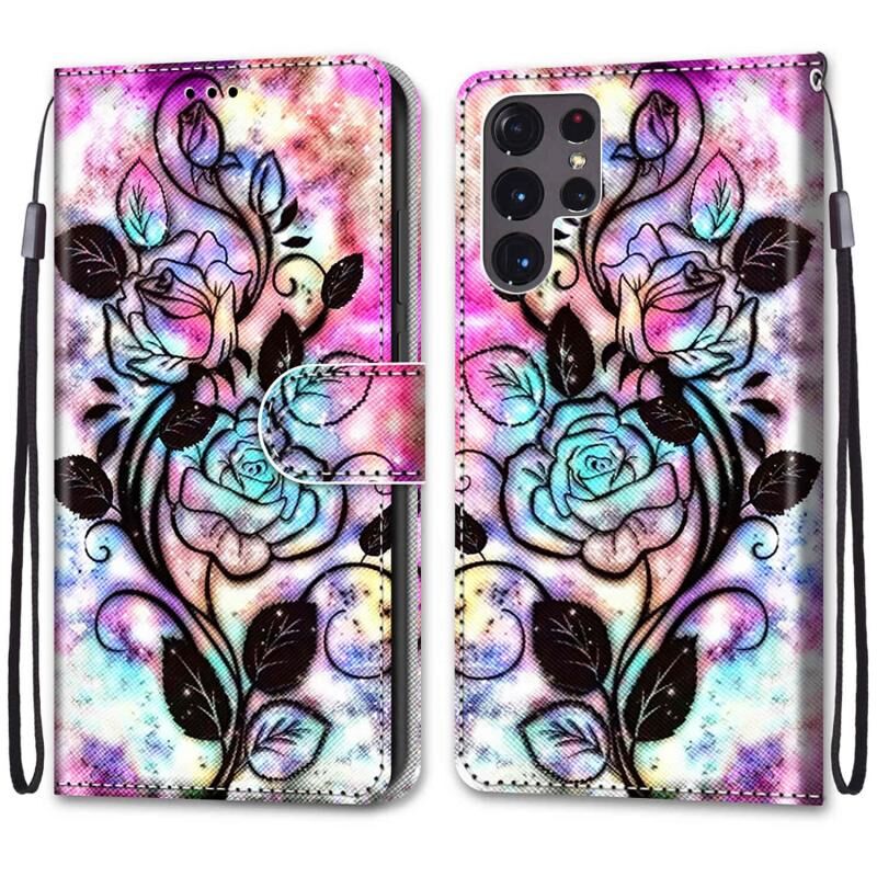 Θήκη τηλεφώνου Samsung Galaxy S22 Ultra 5G από δέρμα με οριζόντιο άνοιγμα, πολύχρωμο σχέδιο με ανάγλυφη υφή, με βάση, θήκες καρτών, πορτοφόλι και κορδόνι (Ροζ Λουλούδια - Γέφυρα του Πύργου).