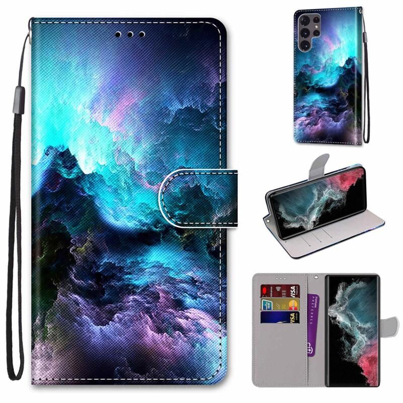 Θήκη τηλεφώνου Samsung Galaxy S22 Ultra 5G από δέρμα με οριζόντιο άνοιγμα, πολύχρωμο σχέδιο, ανάγλυφη υφή, με βάση στήριξης, θήκες για κάρτες, πορτοφόλι και κορδόνι (Πολύχρωμα Σύννεφα)