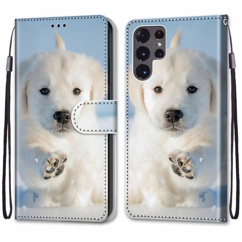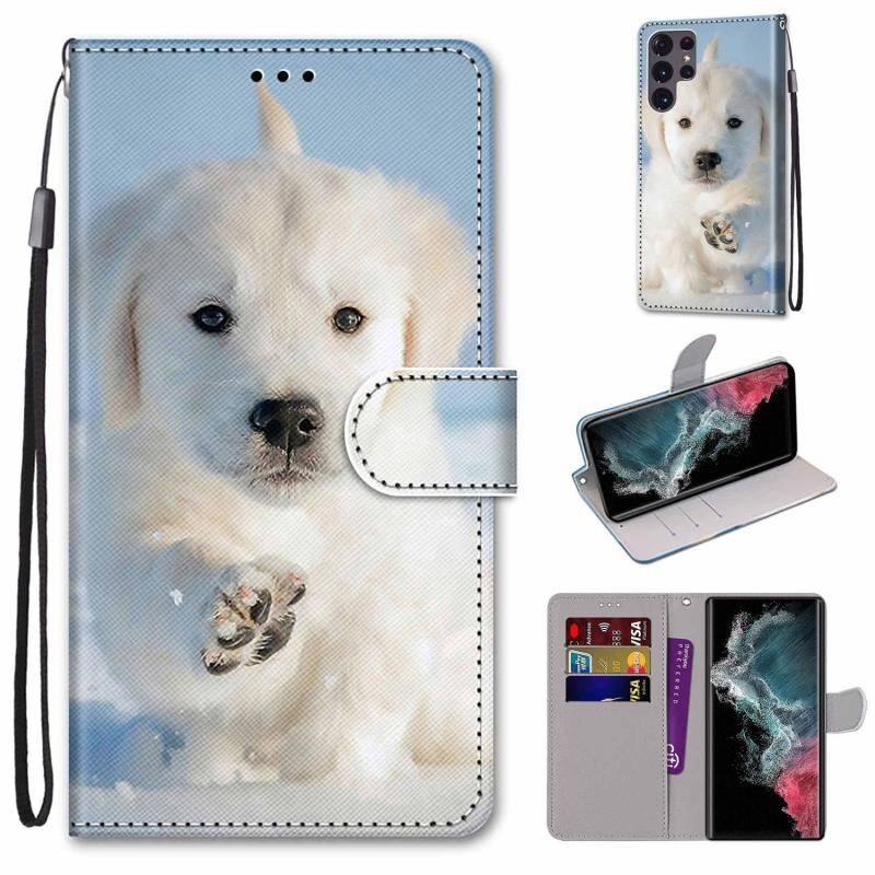 Θήκη τηλεφώνου Samsung Galaxy S22 Ultra 5G από δέρμα με οριζόντιο άνοιγμα, πολύχρωμο σχέδιο με ανάγλυφη υφή, με βάση στήριξης, θήκες για κάρτες, πορτοφόλι και κορδόνι (Snow Puppy)