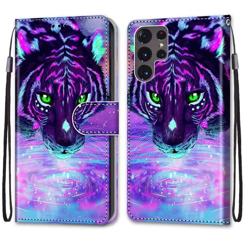 Θήκη τηλεφώνου δέρμα κατακόρυφης αναδίπλωσης για Samsung Galaxy S22 Ultra 5G με σχέδιο χρωματιστής ζωγραφικής, υφή σταυρού, με βάση στήριξης & θήκες καρτών & πορτοφόλι & κορδόνι (Τίγρης που πίνει νερό)