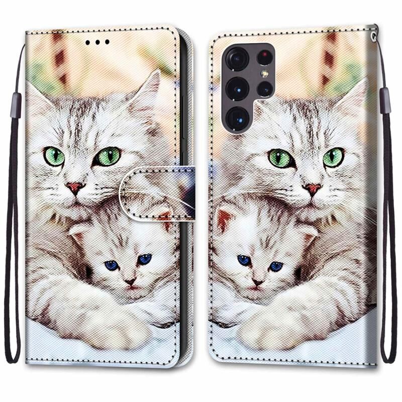 Θήκη τηλεφώνου Samsung Galaxy S22 Ultra 5G από δέρμα PU με οριζόντιο άνοιγμα, πολύχρωμο σχέδιο με ανάγλυφη υφή, βάση στήριξης, θήκες για κάρτες, πορτοφόλι και κορδόνι (Πολύχρωμο στρώμα (Μεγάλη γάτα που αγκαλιάζει γατάκι))