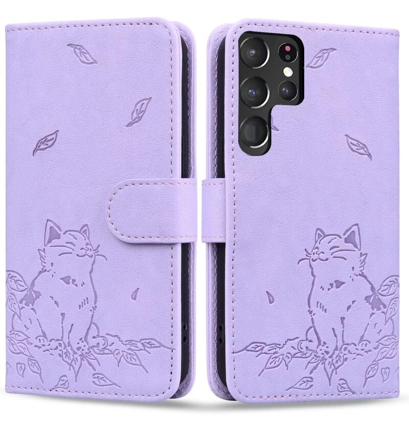 Θήκη τηλεφώνου από δέρμα με ανάγλυφο γατάκι για Samsung Galaxy S22 Ultra 5G (Μωβ)