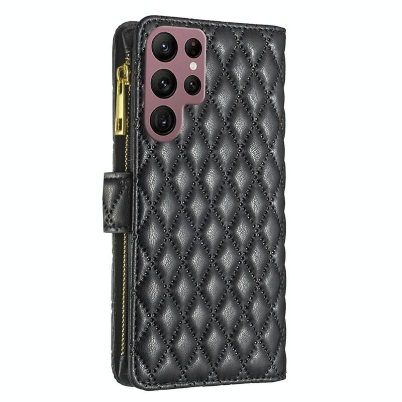 Θήκη τηλεφώνου Samsung Galaxy S22 Ultra 5G, Δερμάτινη θήκη τύπου πορτοφολιού με φερμουάρ και σχέδιο διαμαντόπετρας (Μαύρο)