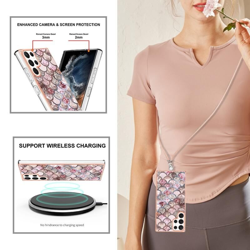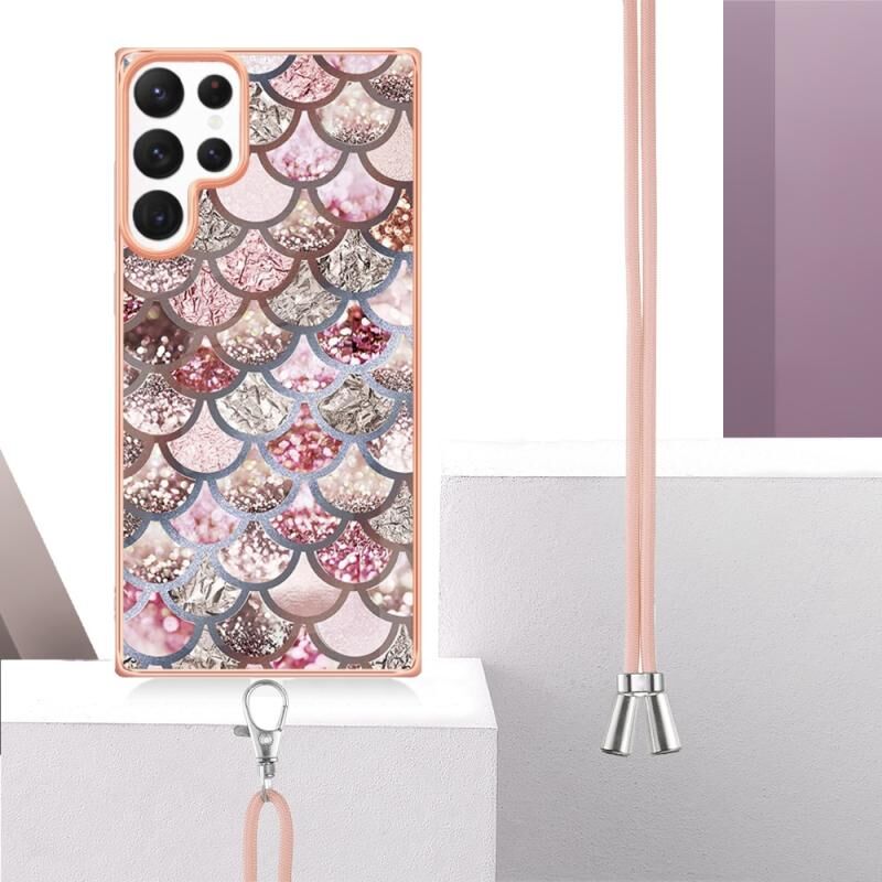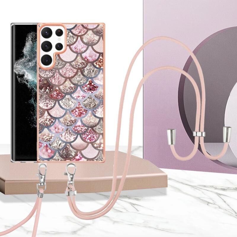 Θήκη κινητού τηλεφώνου Samsung Galaxy S22 Ultra 5G με ηλεκτρολυτική επιμετάλλωση IMD TPU με κορδόνι (Ροζ Λέπια)