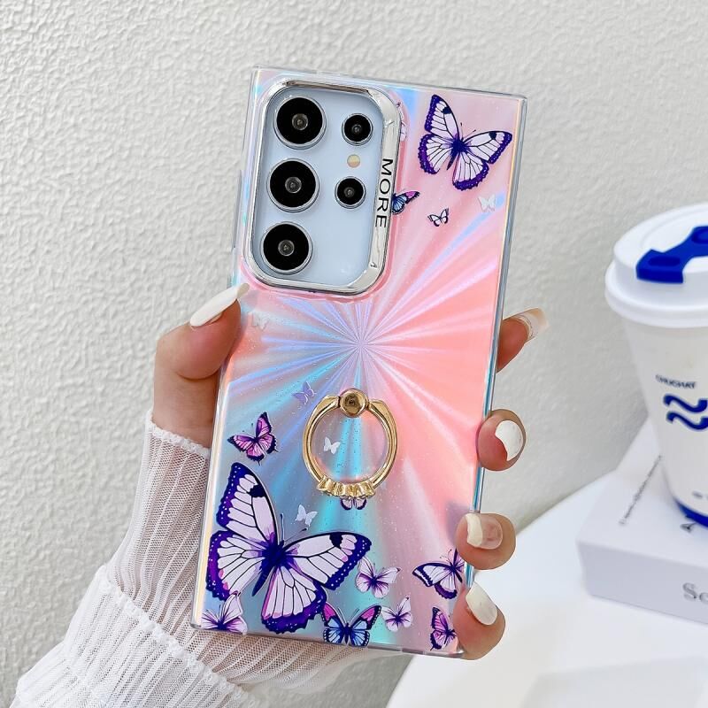 For Samsung Galaxy S22 Ultra 5G Electroplating Laser Butterfly Ring Holder Phone Case(Purple Butterflies AB3)