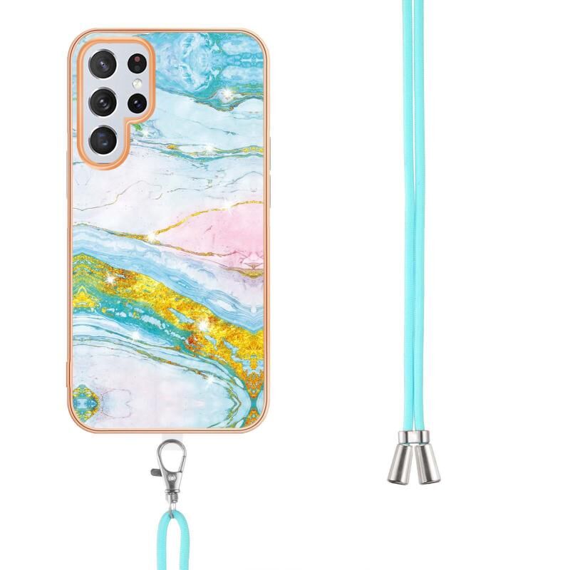 Θήκη κινητού τηλεφώνου Samsung Galaxy S22 Ultra 5G με επιμετάλλωση, σχέδιο μάρμαρου IMD, από TPU με κορδόνι (Μωβ 001)