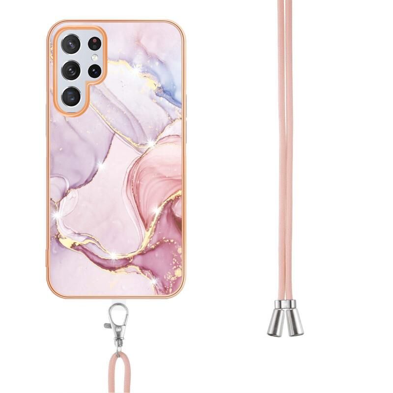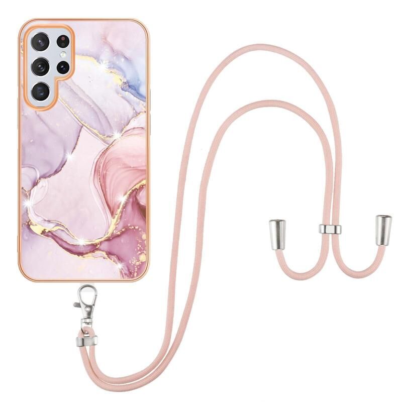 Θήκη κινητού τηλεφώνου Samsung Galaxy S22 Ultra 5G με επιμετάλλωση, σχέδιο μάρμαρου IMD, από TPU με κορδόνι (Μωβ 001)