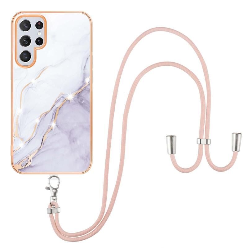 Θήκη κινητού τηλεφώνου Samsung Galaxy S22 Ultra 5G με επιμετάλλωση, σχέδιο μάρμαρου IMD, από TPU με κορδόνι (Μωβ 001)