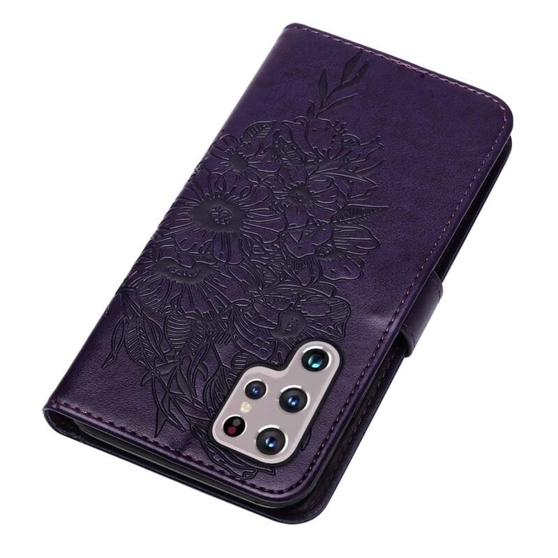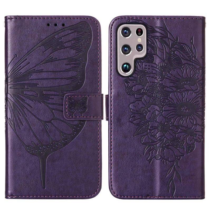 Για Samsung Galaxy S22 Ultra 5G ανάγλυφη πεταλούδα δερμάτινη θήκη τηλεφώνου με θήκη & υποδοχή κάρτας & πορτοφόλι & κορδόνι (σκούρο μοβ)